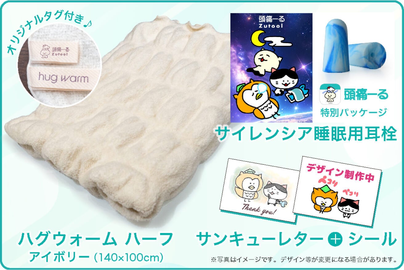 ハグウォーム・ハーフケットが、まるでハグするように心と身体をやさしく包み込みます。睡眠用の耳栓が外の音をやわらげ、静かでゆったりとした休息時間をサポート。今回ハーフケットには、「頭痛ーる」オリジナルのタグをあしらった特別仕様をご用意しました。