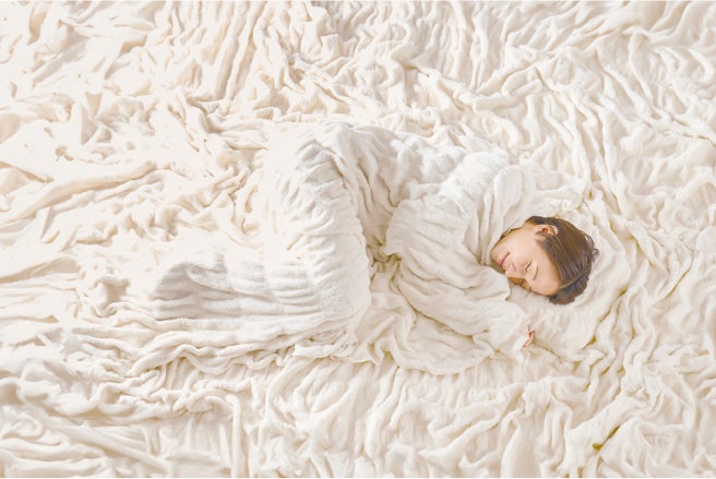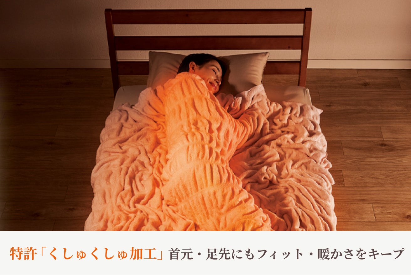 ベースとなっている hug warm(ハグウォーム) は、やさしい「ハグ」の暖かさと心地よさを再現した毛布で、独自の特許技術「くしゅくしゅ加工」と特殊な糸を使用しており、身体にフィットして暖かさを逃がさない、まるで包み込まれるような柔らかな肌触りが特徴です。