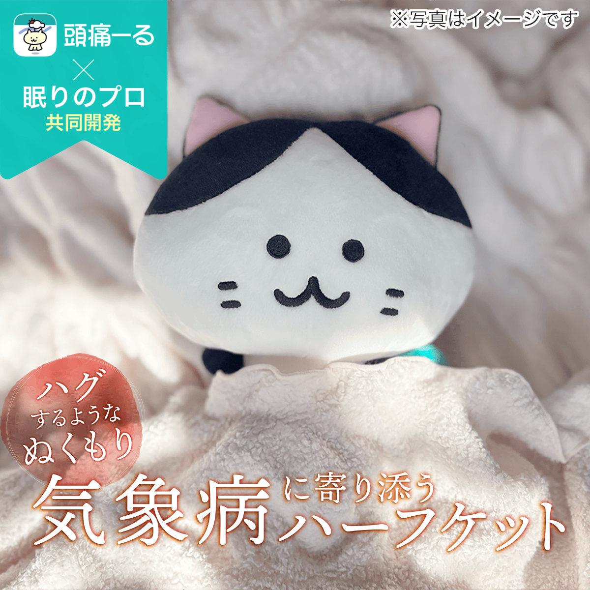 今回の目玉商品のハグウォームですが、実は私は「シングルサイズ」を持っています。フワフワですが、おそらく皆様の想像よりもしっかりした生地でヘタレません。厚めのタオルがクシュクシュ・フワフワしている感じです(伝わっていますかね?)。中に空気が閉じ込められるので、薄いのに本当に暖かくて、肌寒い日も1枚で十分です。この肌触りと保温性に感激して、頭痛ーる運営メンバーからの発案で「日常使いをしていただけるハーフケットを作りたい!」ということで始まったプロジェクトです。仕事や勉強中のひざ掛けや、仮眠時に大活躍すること間違いなしです。今回は特別に「頭痛ーる」のプロジェクトの証として、頭痛ーるマークのネームタグ付きです。ぜひ皆様に使っていただきたいと思います。