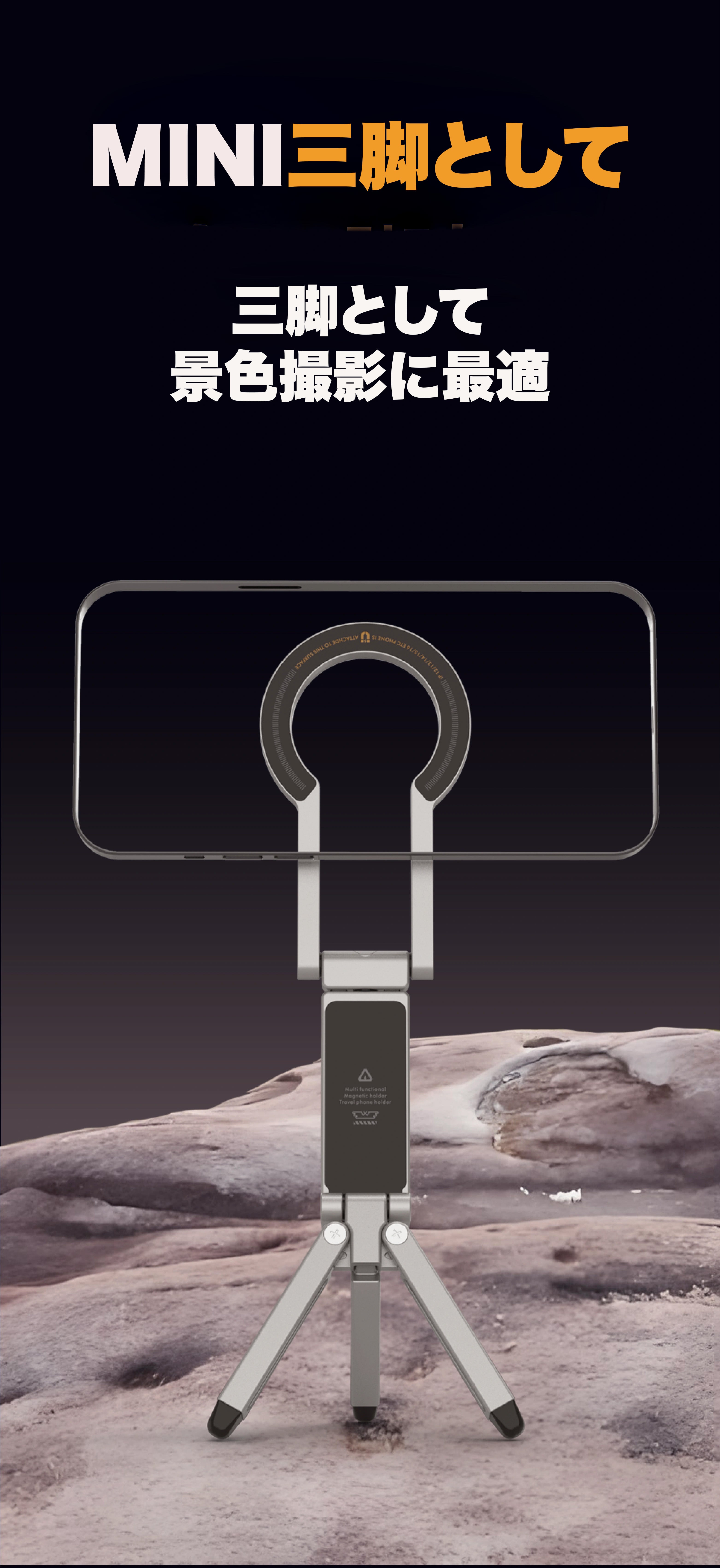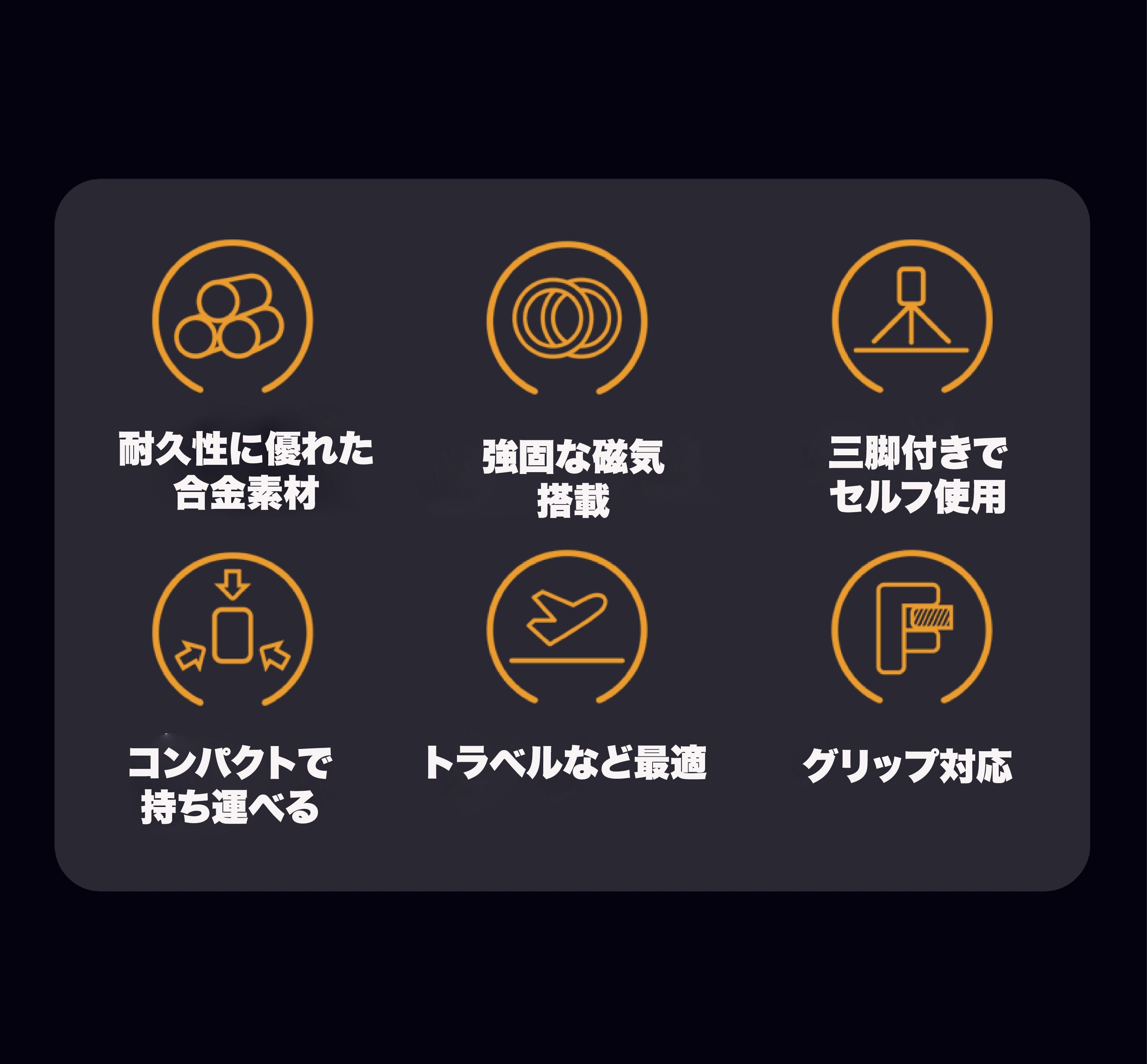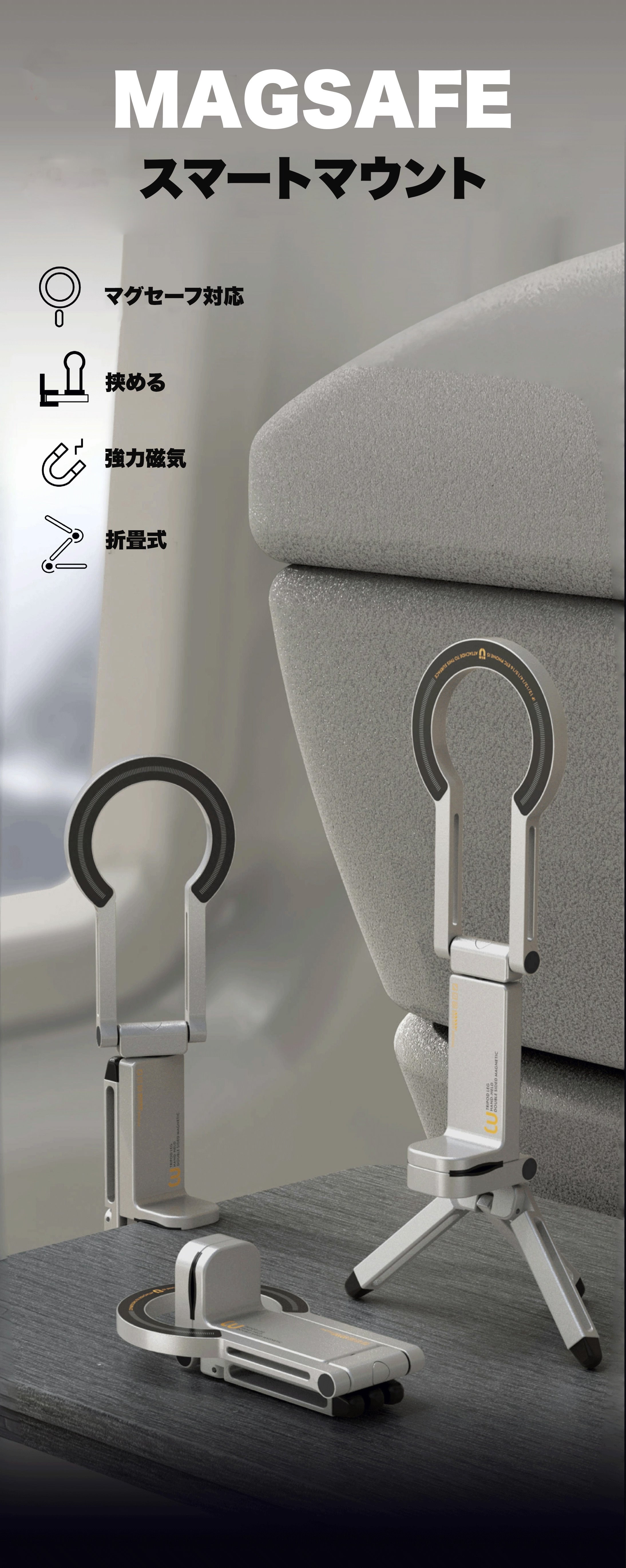 優れた耐久性、コンパクトでで折り畳め、さらにグリップもでき、三脚としても活用できる
