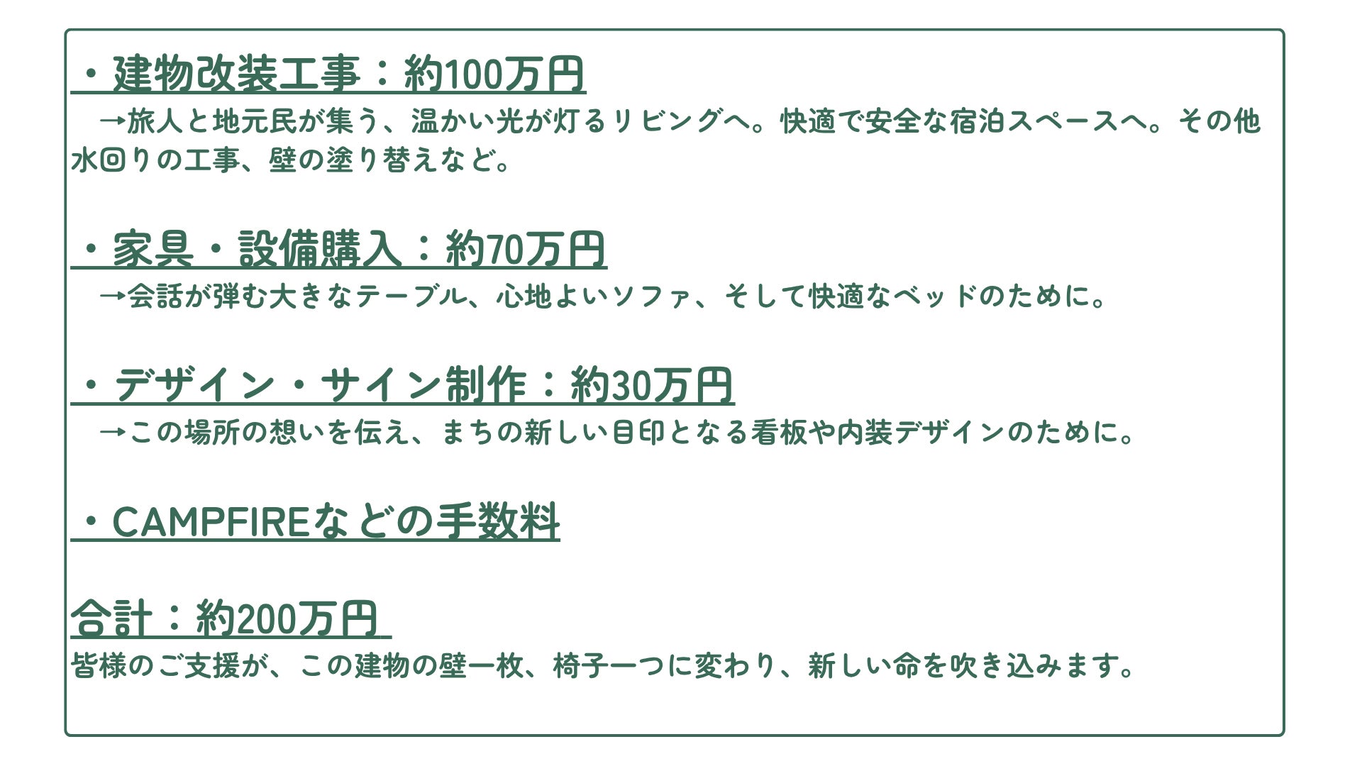 今回のクラウドファンディングでいただいたご支援は、宿の改装費に充てます。