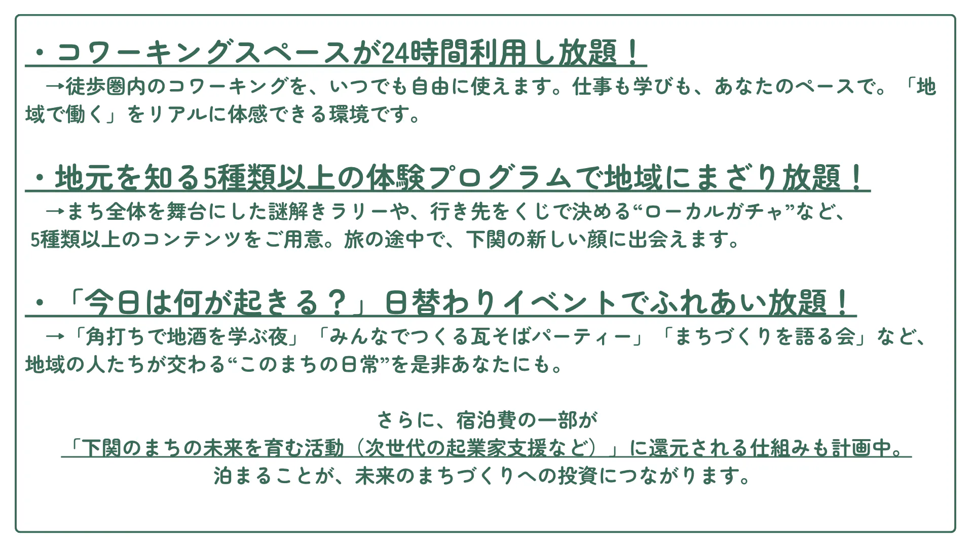 「Neighbors Stay」は、下関を「通過されるまち」から「立ち寄り、混ざり、また帰ってきたくなるまち」へ変え、子どもたちが誇れる街にする挑戦です。