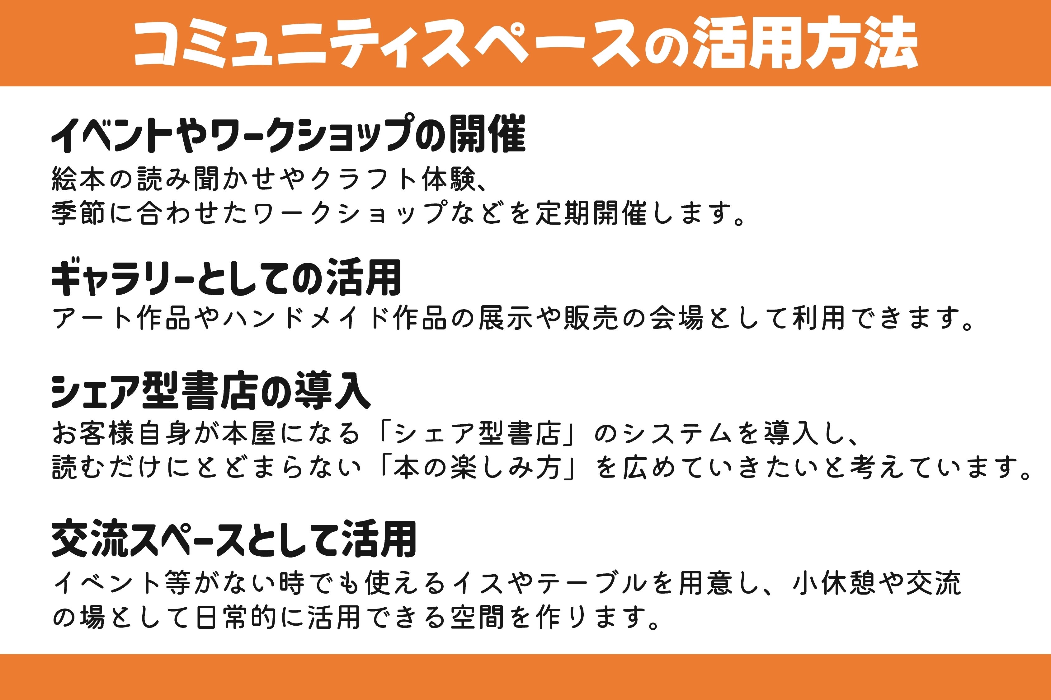 このコミュニティスペースでは、以下の活動を通じて「本・人・文化」をつなぐ交流を創出していきます。