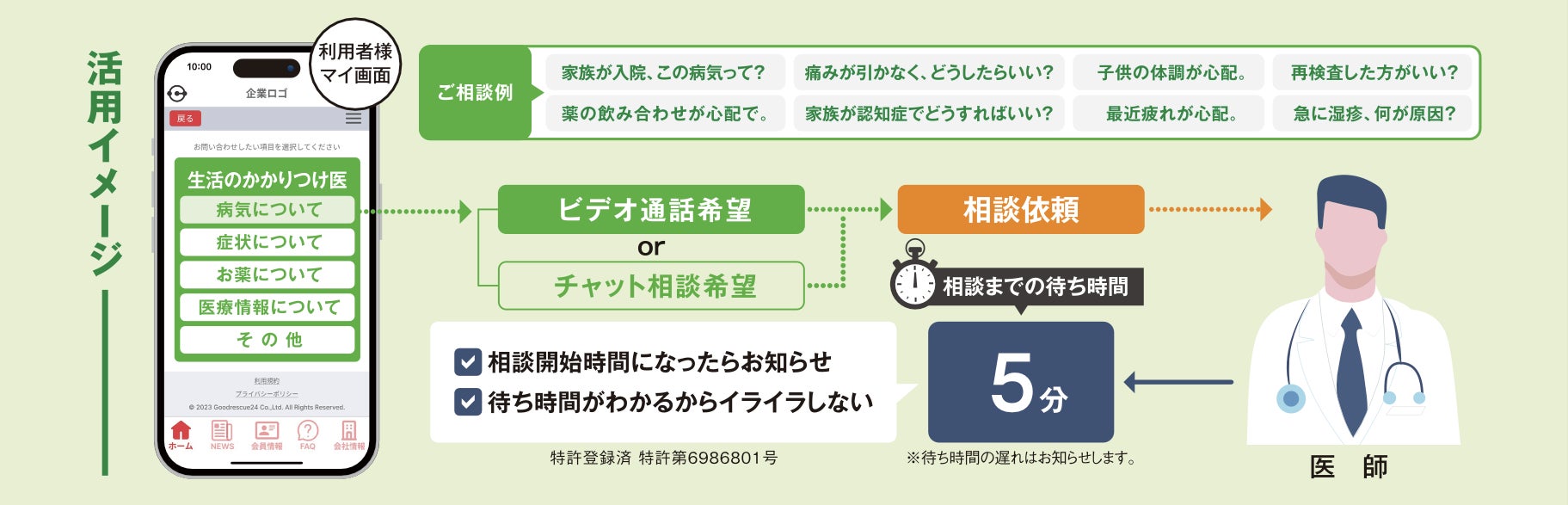 当社の特許システムでは、チャットもしくはビデオ通話で医師につながるまでの待ち時間が表示されるので、「どれくらい待つのか分からない」という不安がありません。病院では実現が難しい、無駄なくストレスのない相談環境をつくれるのは、このサービスならではの強みです。