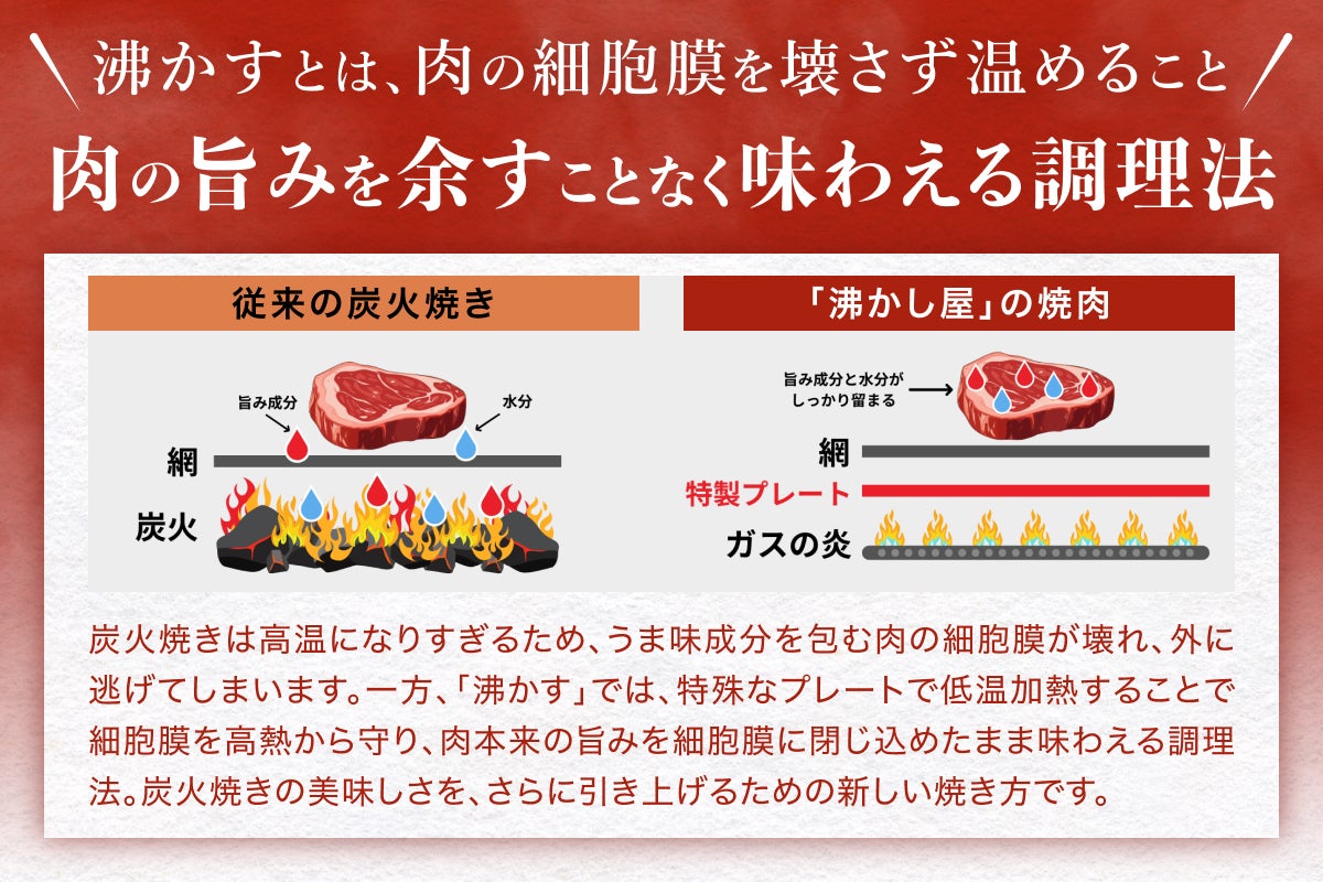 皆様が「美味しい焼肉」と聞いて思い浮かべるのは、きっと「炭火焼き」ではないでしょうか?しかし実は、炭火焼き以上に肉の美味しさを引き出せる調理法があることを知っていただきたいのです。それが、私たちの新店舗「沸かし屋」が提唱する肉の旨みを最大化する調理法―「沸かす」という方法です。