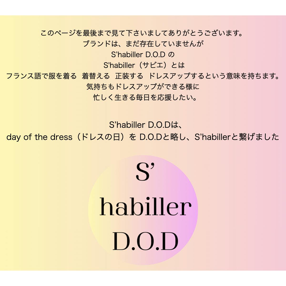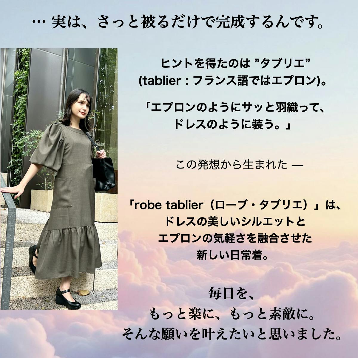 • こんにちは。本日で掲載から8日目を迎えました。まだまだ手探りですが、日々見てくださる方がいることに励まされています。今日は、なぜこのプロジェクトを始めたのか少し綴ってみたいと思います。日常の服に、ドレスを重ねる。気負わず着られて、少しだけ気分が上がる。そんなデイドレスを作りました。このドレスは、フランスのエプロンドレスrobe tablier から着想しています。いつもの服に重ねるだけで、少しドレスのような雰囲気に。日常のスタイルを少し楽しくしてくれる一着です。このドレスを作ろうと思ったきっかけは、朝の服選びの時間でした。もう少し気軽に、でも少し気分が上がるスタイリングがすぐ出来たら。実は、私自身は服が大好きなので服を選ぶ時間そのものも楽しめてしまうタイプです。それでも忙しい日常の中では、「今日は何を着よう」と迷う時間が少しだけ負担に感じることもあります。そんな思いから、robe tablier の形をベースにしたデイドレスを考え始めました。ブランド名のS’habiller.D.O.Dは、S’habiller day of the dressを略しています。隠れている「day of the dress」は日本語にするとすごく素敵で今日はドレスの日。という意味になります。忙しい日常の中で、少し気分が上がる。そんな日が、少し増えたら嬉しいです。 もっと見る