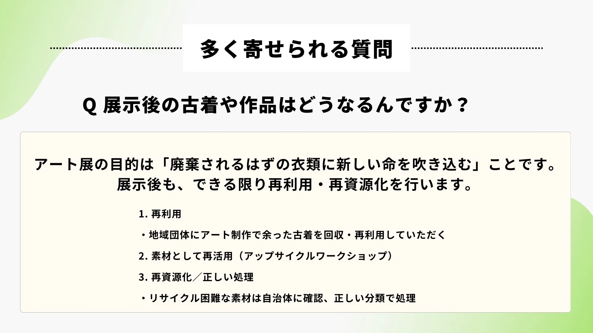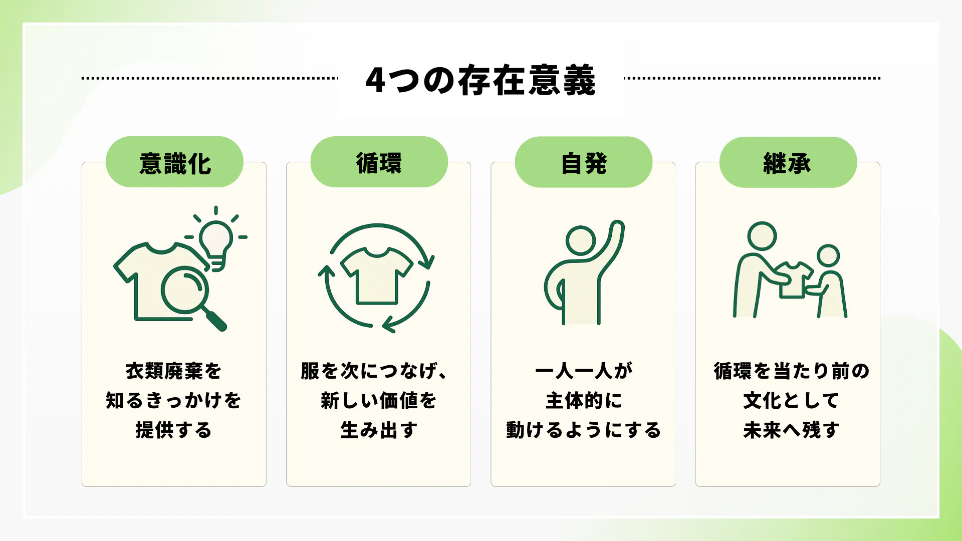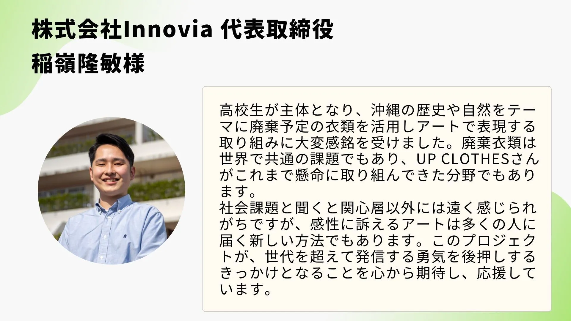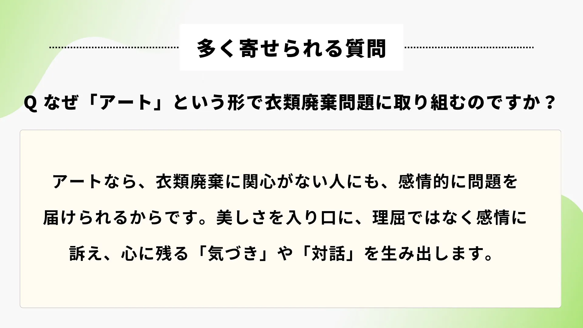 衣類を“捨てるもの”から“つなぐもの”へ変えていくように、アートを通して「課題を自分ごとにする文化」を広げていきます。