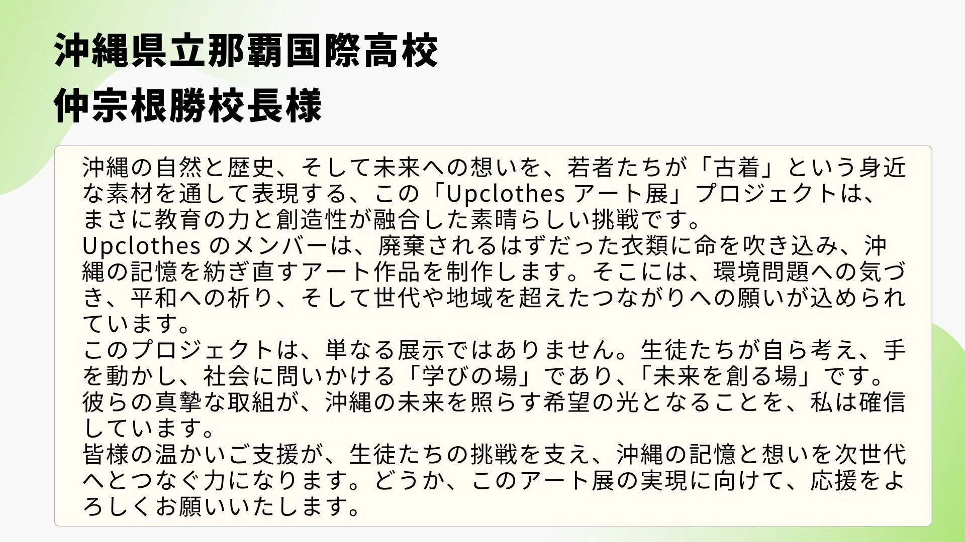私たちは、2026年夏、廃棄されるはずだった衣類に“新しい命”を吹き込み、沖縄の自然や戦争の記憶を表現するアート展に挑戦します!!