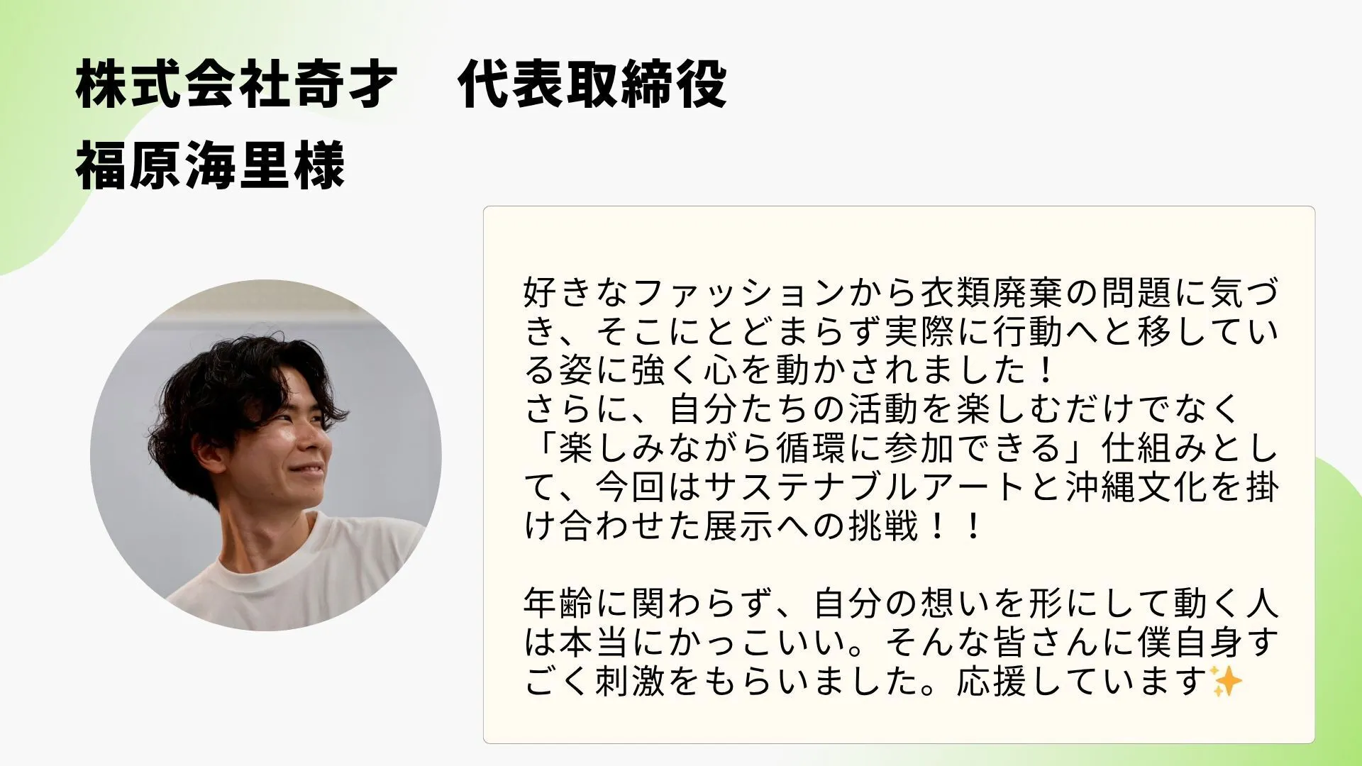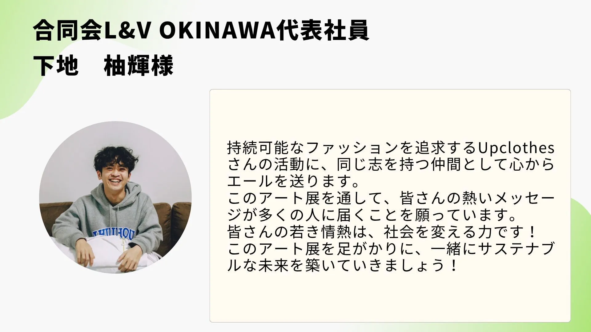 このアート展から生まれる出会いや対話が、未来の行動者を育て、社会の在り方を少しずつ変えていくと信じています。