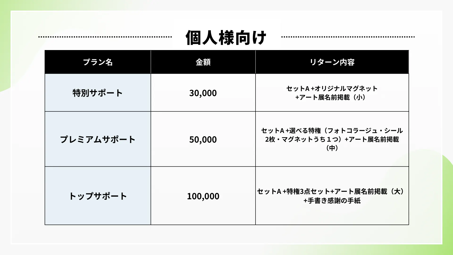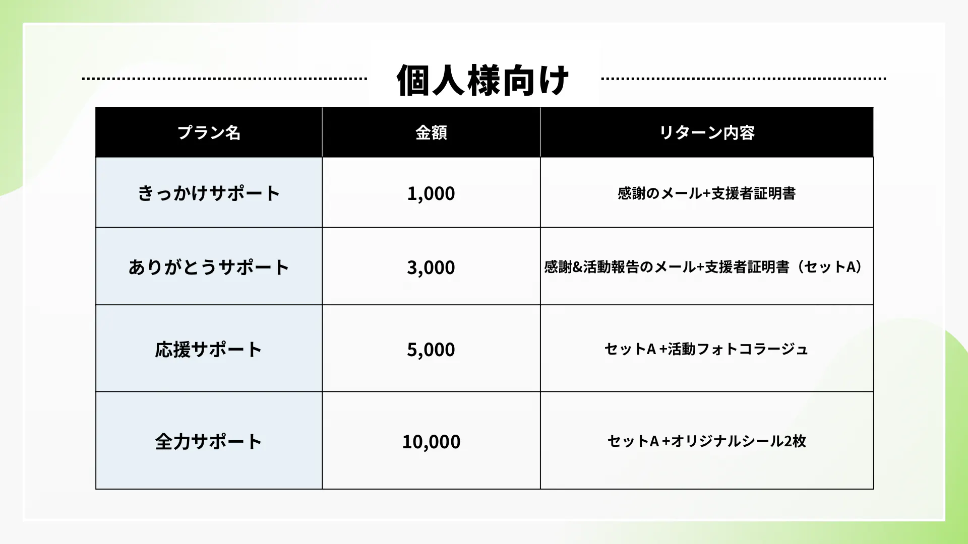 「個人様向け」「法人・団体様向け」、それぞれのプランをご用意しております。