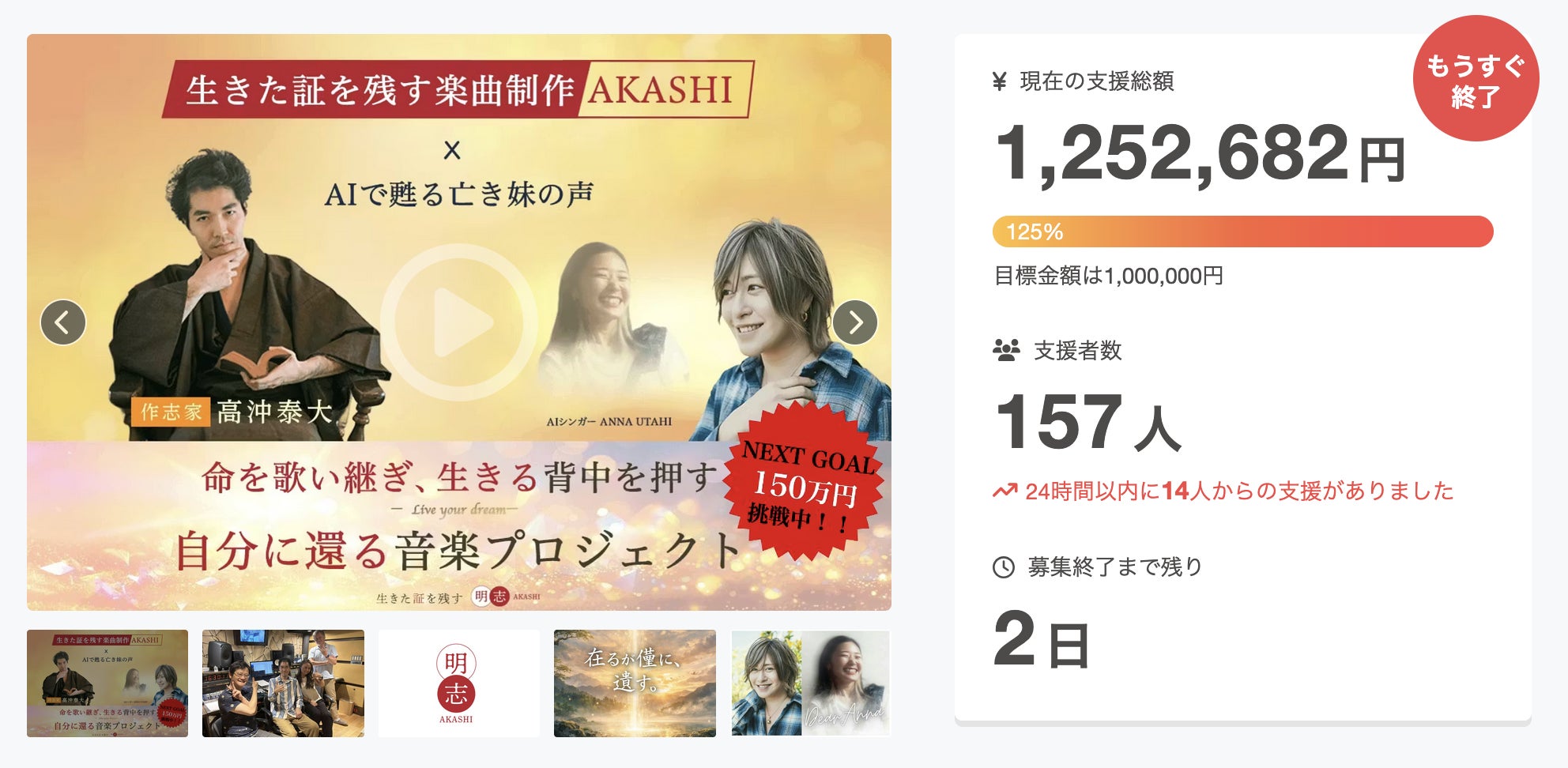 2026/02/01 00:22皆さまの応援のお陰様で、見事ネクストゴール150万円とご支援者様200人を達成することができました!たくさんのご支援・応援本当にありがとうございました。スタート当初から感謝でいっぱいでしたが、こうして結果を残すことができて本当に有り難いです。ご支援いただいた皆さま、応援していただいた皆さま、真摯に向き合ってくださった皆さま、支えてくださった皆さま。たくさんの愛を受けて作る作品となったことに心から御礼を申し上げます。最終的にご支援金額 1,506,576円ご支援者様 207人で終えることができました。ここから作品を通じて恩返しをしていきます。すでに制作は始まっていますので、楽しみにしていてください。改めて本当にありがとうございました!大きな愛をありがとうございます!! もっと見る
