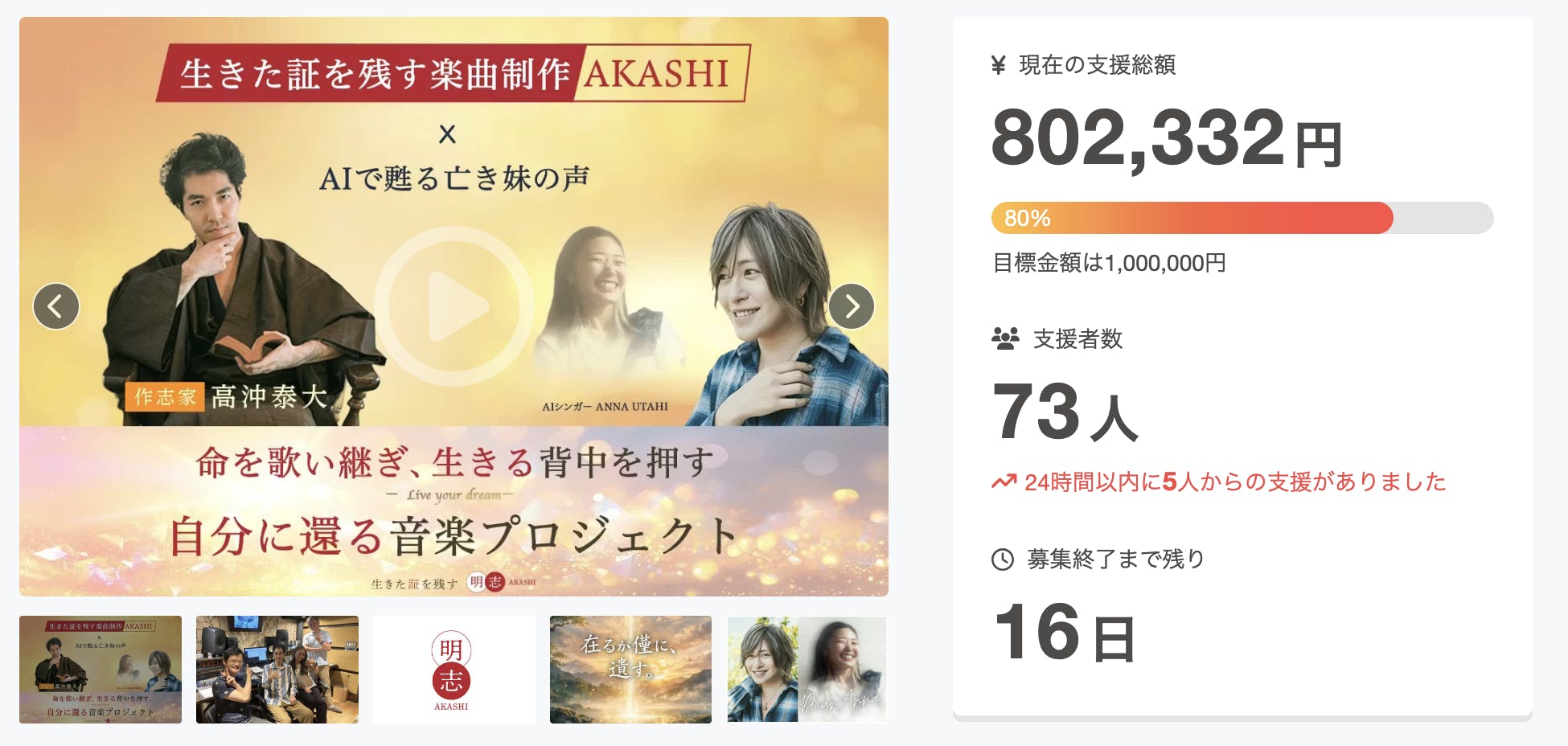 ご支援者様の数も73名となり、達成率はついに80%を超えました!!