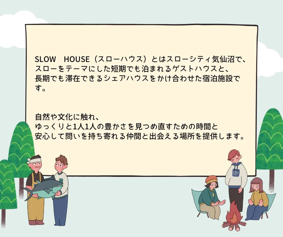 SLOW HOUSEは、2022年9月にスローシティ気仙沼で「人生の転機に訪れてほしい場所」をコンセプトに立ち上がりました。