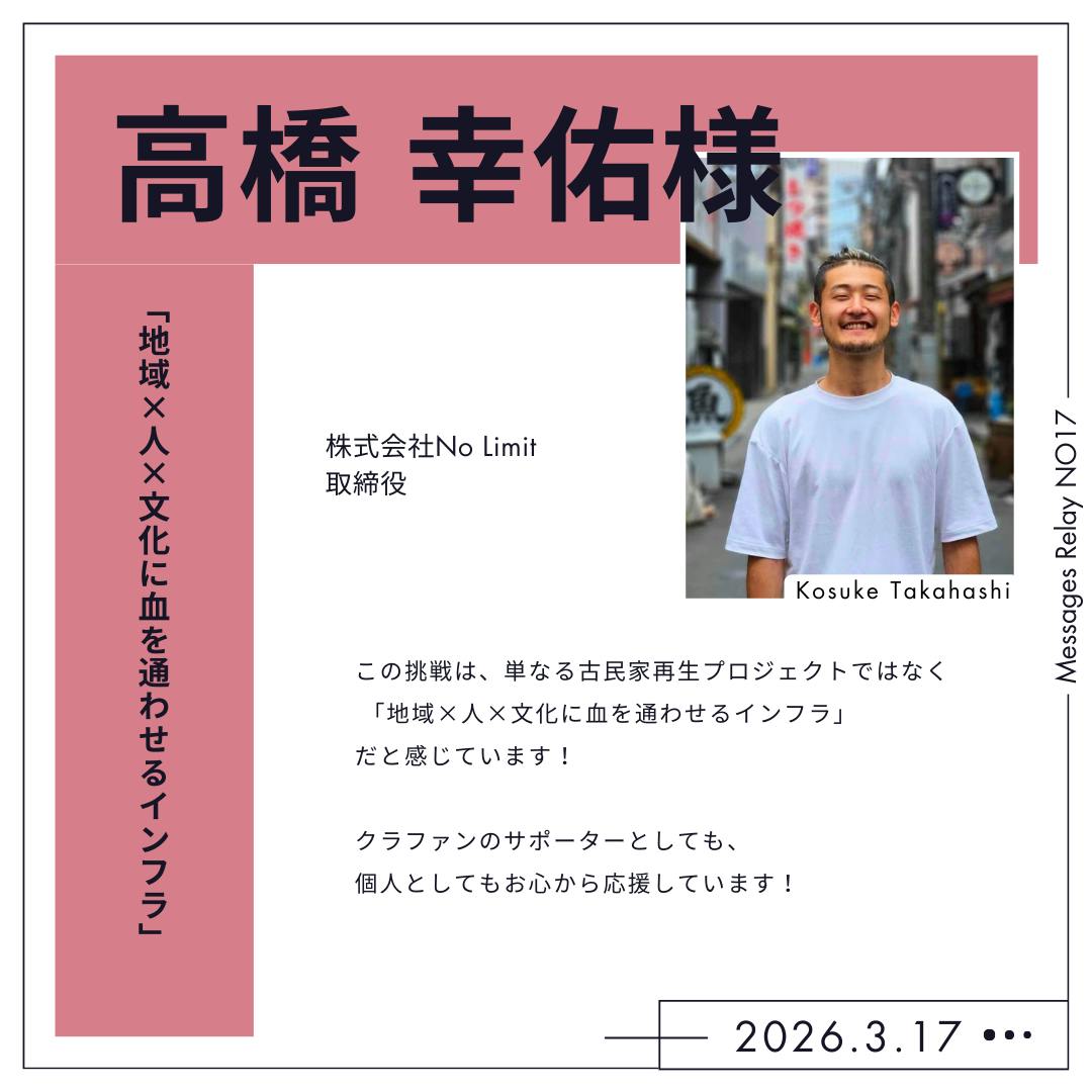 2026/03/15 09:01間もなくご支援者60名&ご支援額50%!クラウドファンディングも間もなく真ん中、ぜひ引き続き拡散・ご支援よろしくお願いいたします(^^)昨日はスローハウス青森に遊びにいらしてくださった方(ご支援50人目のキリ番)とのれん用の竹を切って、一緒に飾りました♪のれんがあると一気にお店の感じが出ますね♪さおりさん、ありがとうございました!***さて本日の応援メッセージは、神社仏閣お掃除ボランティアteam109に関わった方であれば皆ご存じ「なるみ」!津軽33観音巡りガイドブック出版の際、機会をいただいて伺った倫理法人会での講話にて興味を持ってくれてボランティア団体の立ち上げから運営、助成金の申請から報告などありとあらゆることをサポートし続けてくれています。「すごくいい活動だと思ったから」「何でも頼ってくれ」と言って連絡してくれた鳴海ですが、私は当時「人に頼るのが大の苦手」。。「うーん、でもね」とせっかくサポートを申し出てくれているのに申し訳なくて断るという謎の行為を繰り返していましたが(笑)「人をサポートするのが好きでやりがいなんだ」とめげずにアプローチしてくれる姿を見て、段々心を開くようになり今では、当時では考えられないくらいそして驚くほど丸投げでごめんねと思うくらい仕事をお願いしていますwwwwwwゲストハウスの改装を見守る鳴海私が表で「あれやりたい」「これやりたい」を繰り広げているのは後ろで鳴海が事務作業などを率先して行ってくれているからです。「津軽でNO1のNO2になる」という分かりづらい目標を持つ鳴海(^^)w普段は2児の父でもあり、休日は野球のコーチをしていたりもするマルチプレーヤー。彼の存在が、ボランティア団体をイベントを支えてくれています。これからは神社仏閣お掃除ボランティアteam109の延長線上となる「一般社団法人紫」理事としてまたともに歩んでいきます!鳴海、いつもありがとうこれからも宜しくね~! もっと見る