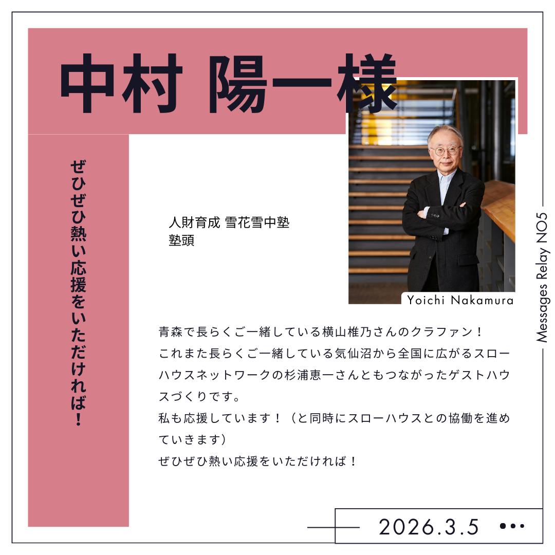 本日は同塾の塾頭であり、今回のゲストハウスの陰(むしろ光)の立役者でもあります、中村陽一先生からメッセージを頂戴しました。