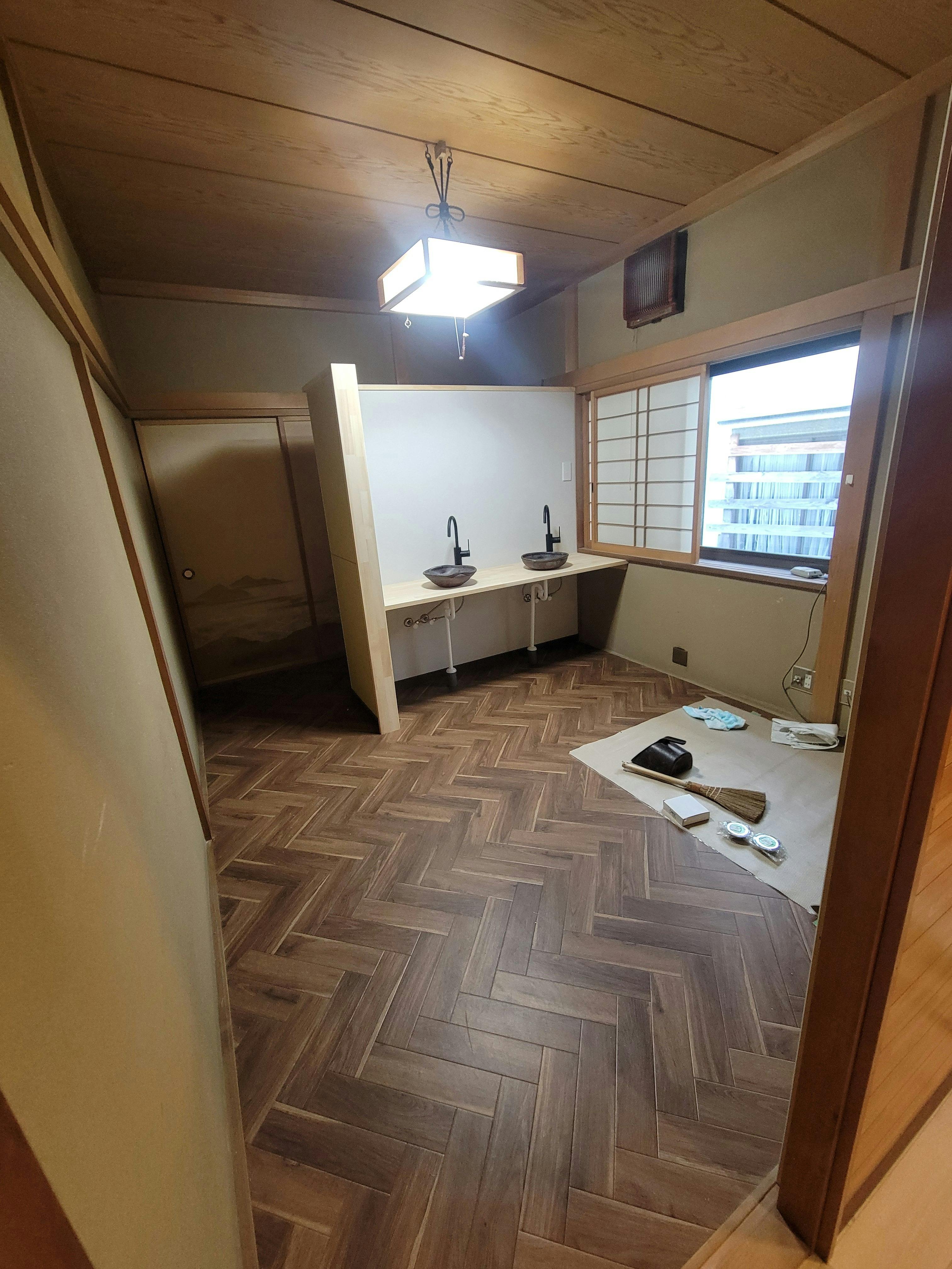 改装途中のランドリースペース。例の蛇口が2つ奥に、、!