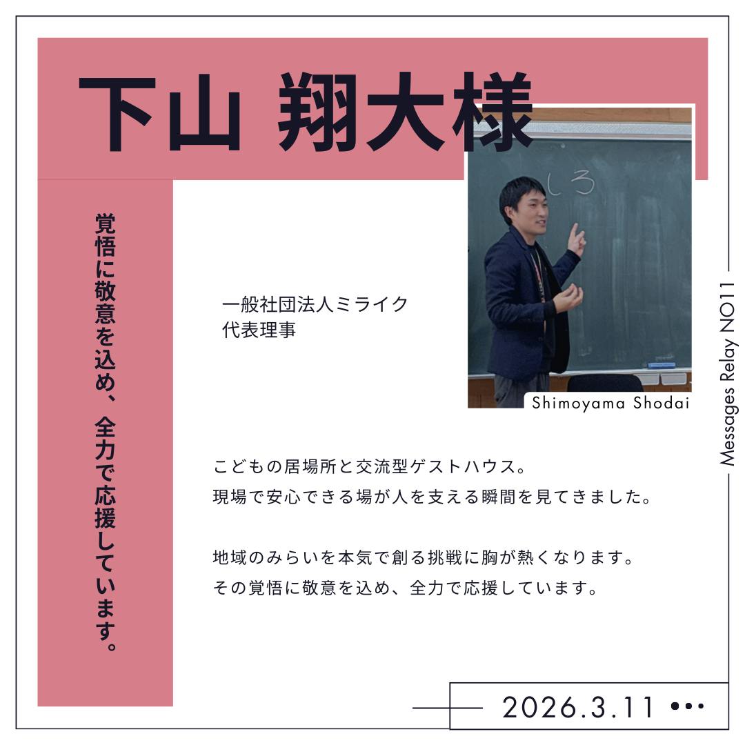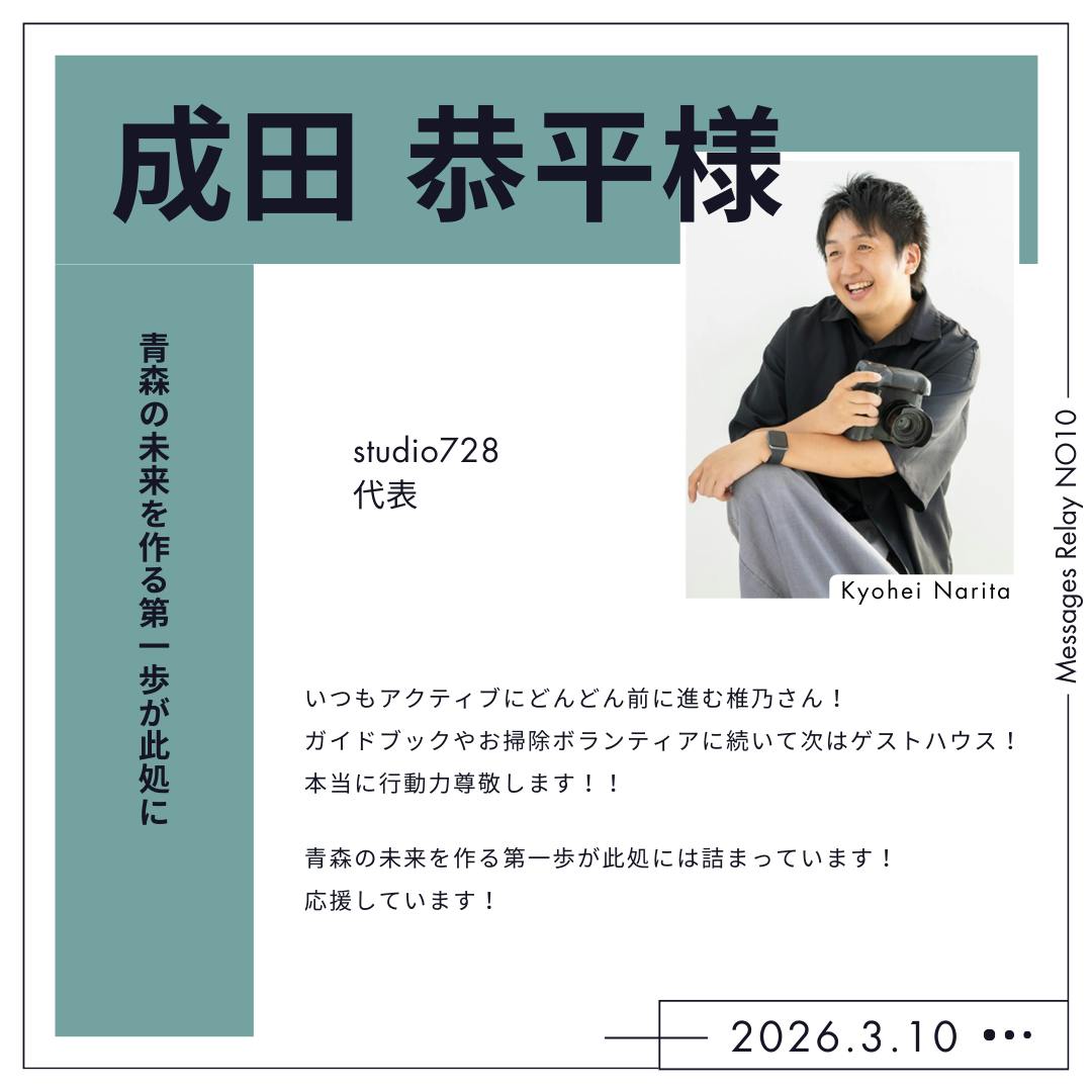 昨日は東日本大震災から15年が経った日でした。当時私は専門学校を卒業し、就職を控え新しいアパートに引っ越したばかりというタイミングで埼玉にいました。震災のときには銀行にいて、上から蛍光灯が落ちてきて割れたりと勿論大きく揺れアパート(4階)に戻り、ありとあらゆるものが倒れている光景を見て驚き。家族も心配しているだろうなと思って電話を掛けて見たけど繋がらない、、まだよくわかっていなくて、でもふとテレビをつけたら津波の映像。。あの日のことは、きっと誰もが一生忘れないのではないかと思います。忘れない、だけでなく希望も伝えられる人に希望を見せられる人になるようこれからも頑張ろうと心に改めて誓いました。さて、そんな「災害」についても言及してくださっている渉一さんの応援メッセージ!メッセージをくださった日の少し前かな??は、青森の豪雪に対するボランティアが各地から駆けつけてくださっていました。実はスローハウスの発祥である気仙沼も、もとは災害ボランティアの方や有志の方たちが集まり「あそこ行ったら泊まれるらしいで」的な話がco-baから始まり、どんどん人が集まるようになっていった、、という流れがあったそうで。このお話も必然だったのだろうなあと感じています。スローハウス青森は災害時はもちろん、昨日の日常的な支援ができる、人の心の拠り所でありたいと思います。渉一さんは長年に渡り応援してくださっていていつもチャンスやご縁をくださいます。倫理法人会さまでの講話娘も可愛がってくださり、なついていますwいただいたご縁を大切に、またこれからも邁進してまいります。渉一さん、いつもありがとうございます!これからも頑張りますので、引き続きよろしくお願いいたします~!!