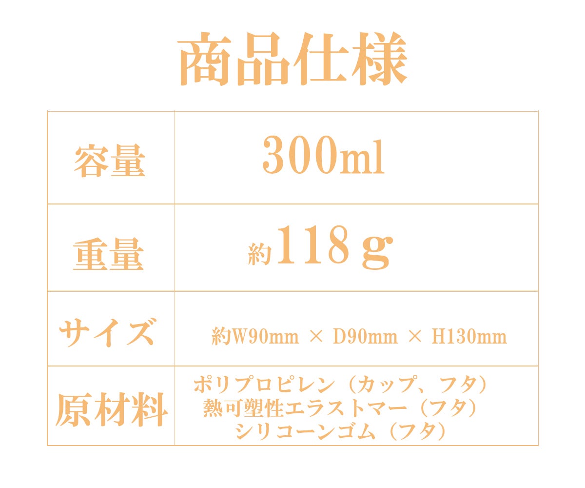 ポリプロピレン(カップ、フタ)/熱可塑性エラストマー(フタ)/ シリコーンゴム(フタ) 環境配慮:外装パッケージの簡素化