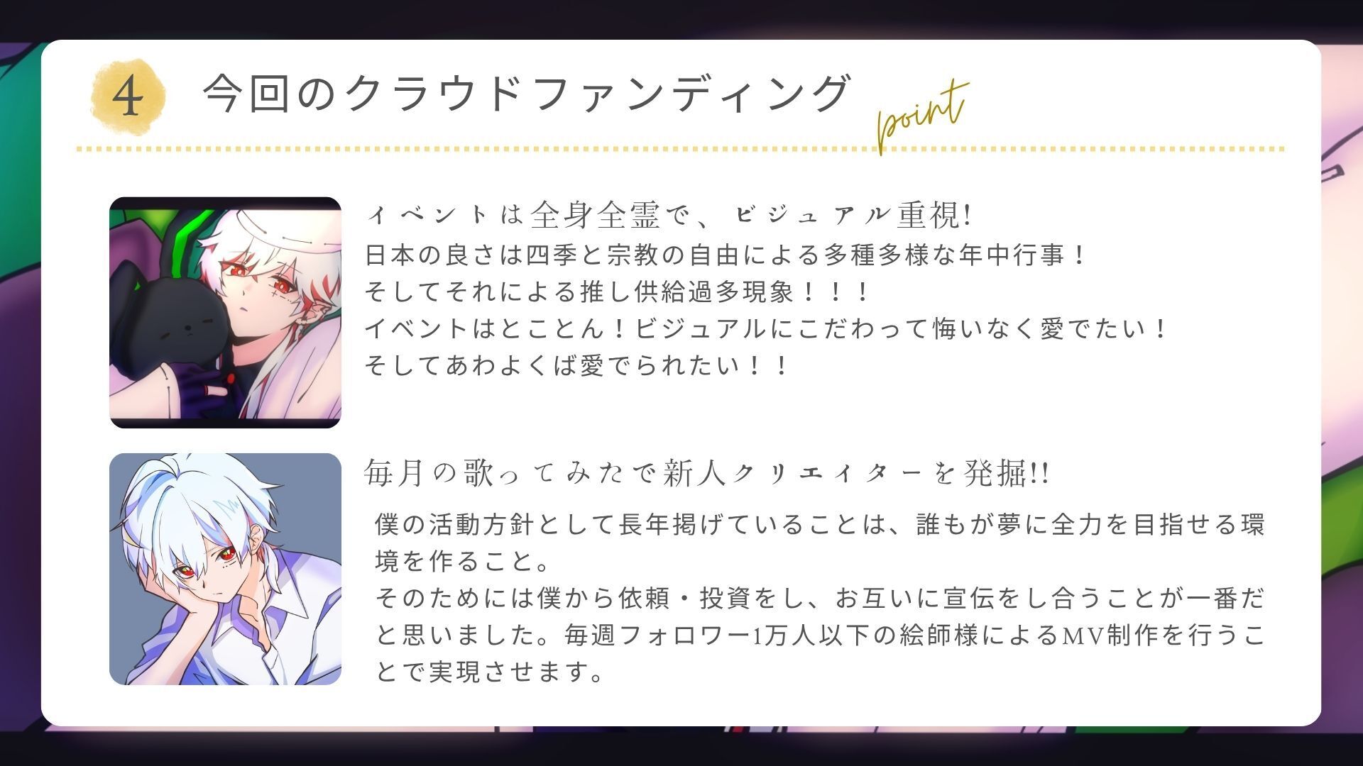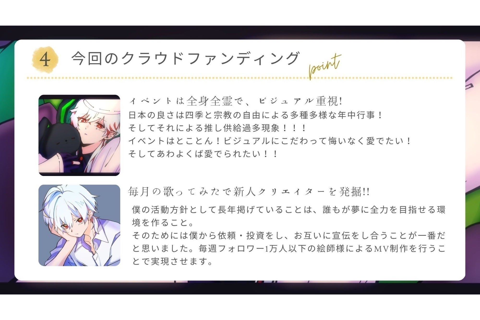 「歌ってみたMV」を継続して投稿するため、今回このプロジェクトを立ち上げました。