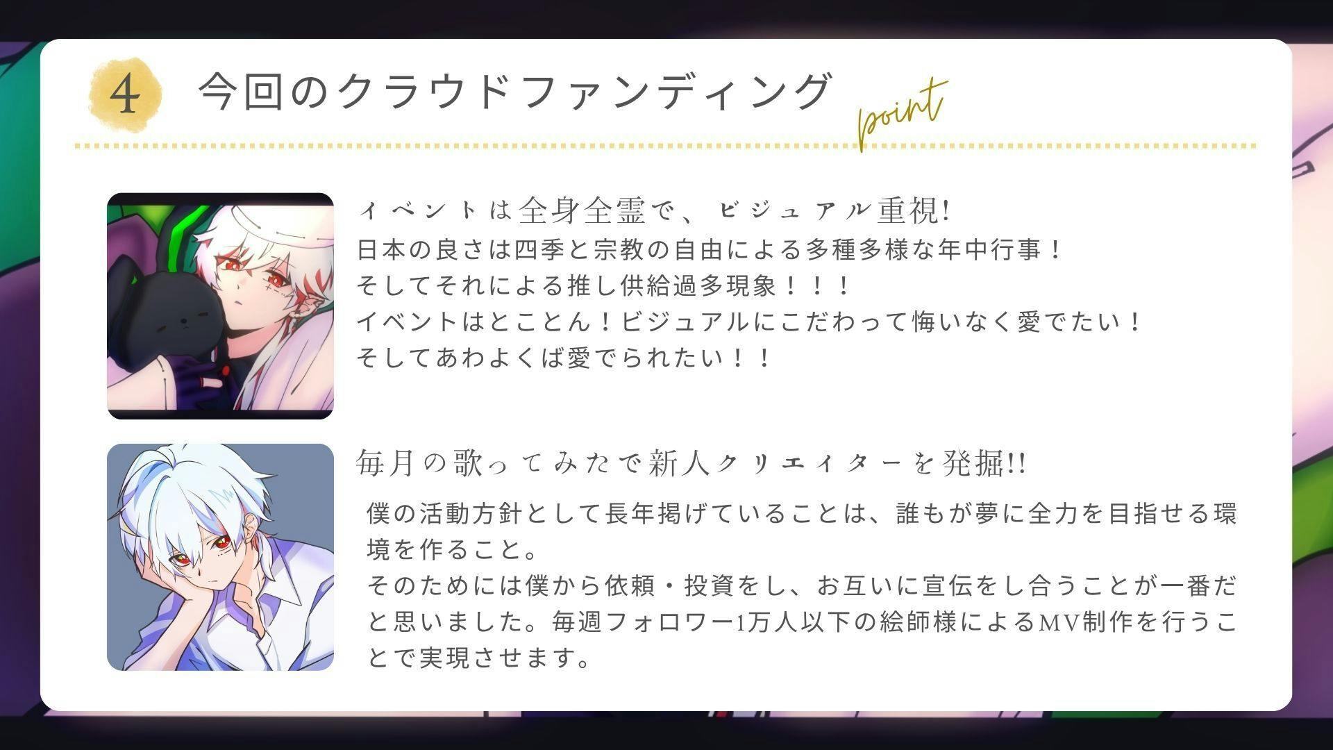 「歌ってみたMV」を継続して投稿するため、今回このプロジェクトを立ち上げました。