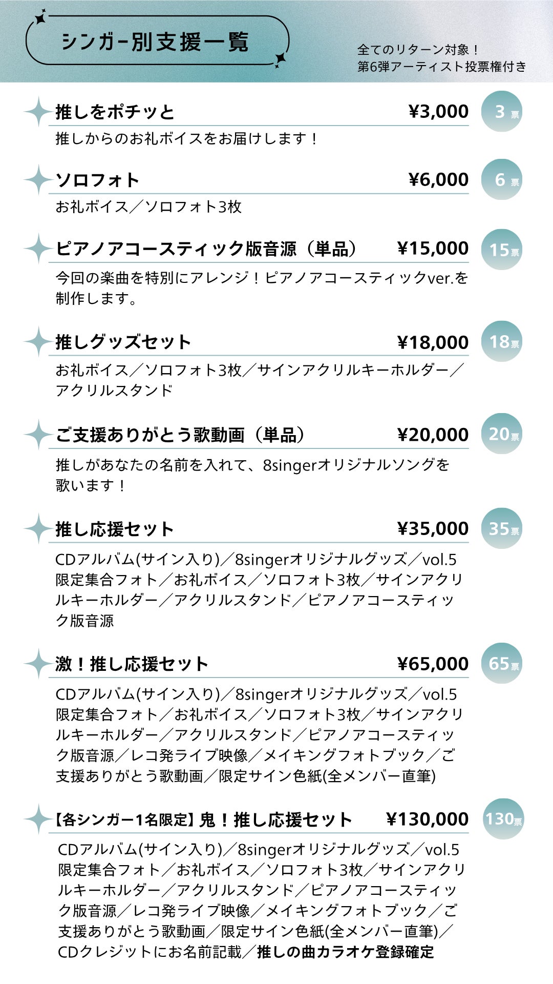 すべてのリターンに「第6弾アーティスト投票権」を付けました。つまり…