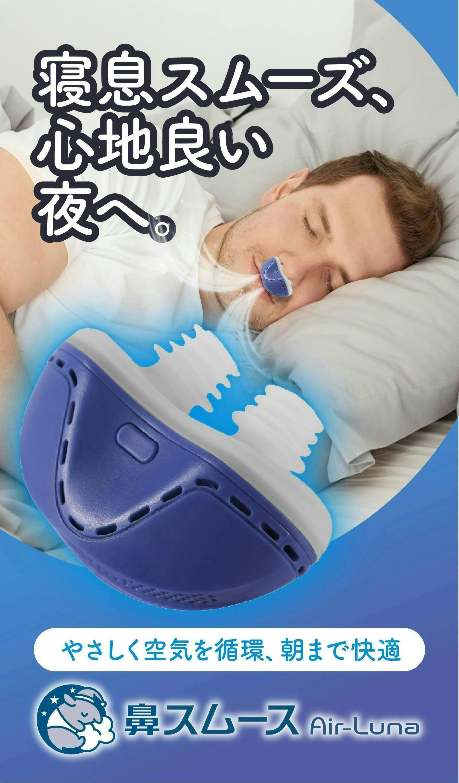 【鼻スムース Air-Luna】は優しく空気を循環し、寝息をスムーズにするおやすみグッズです。