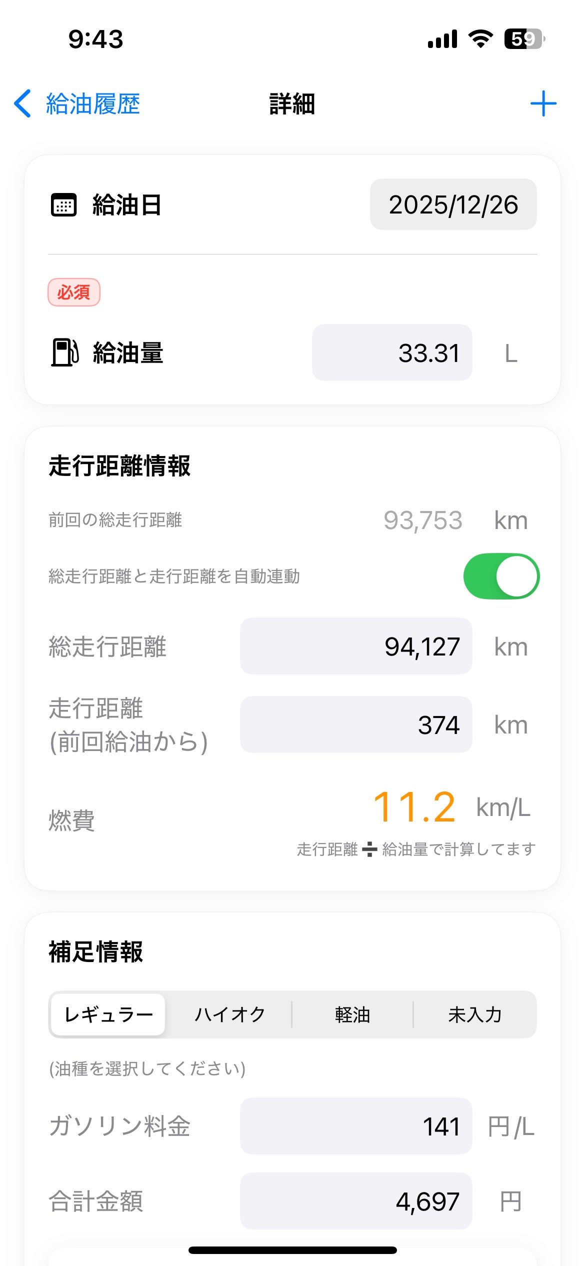 昨日、ガソリン給油したので給油履歴を登録しました。