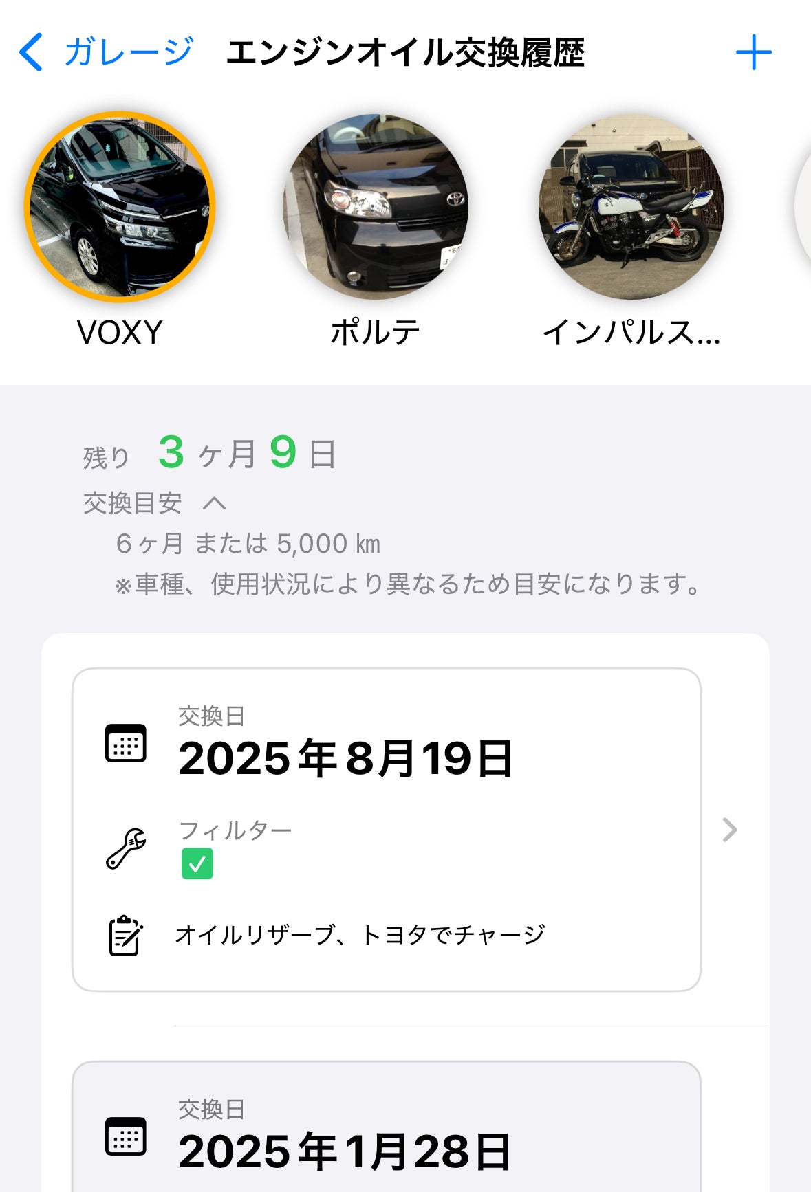 愛車のメンテ情報をまとめて管理し、次の交換時期がひと目で分かるようになります。
