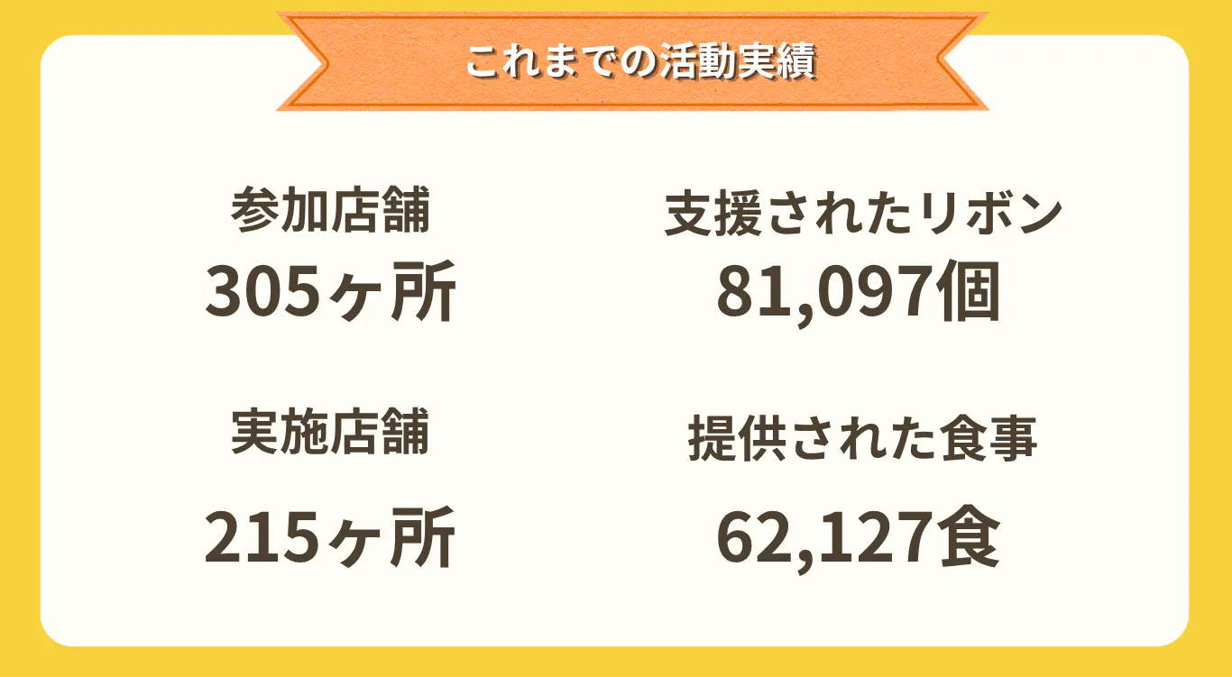 飲食店を利用するお客様が1つ300円でリボンをお店に支援すると、所定の年齢の範囲にいる子どもは、飲食店に飾られたリボンを使うことで、必要な時には誰でも、お店が営業している日には無料で食事ができます。