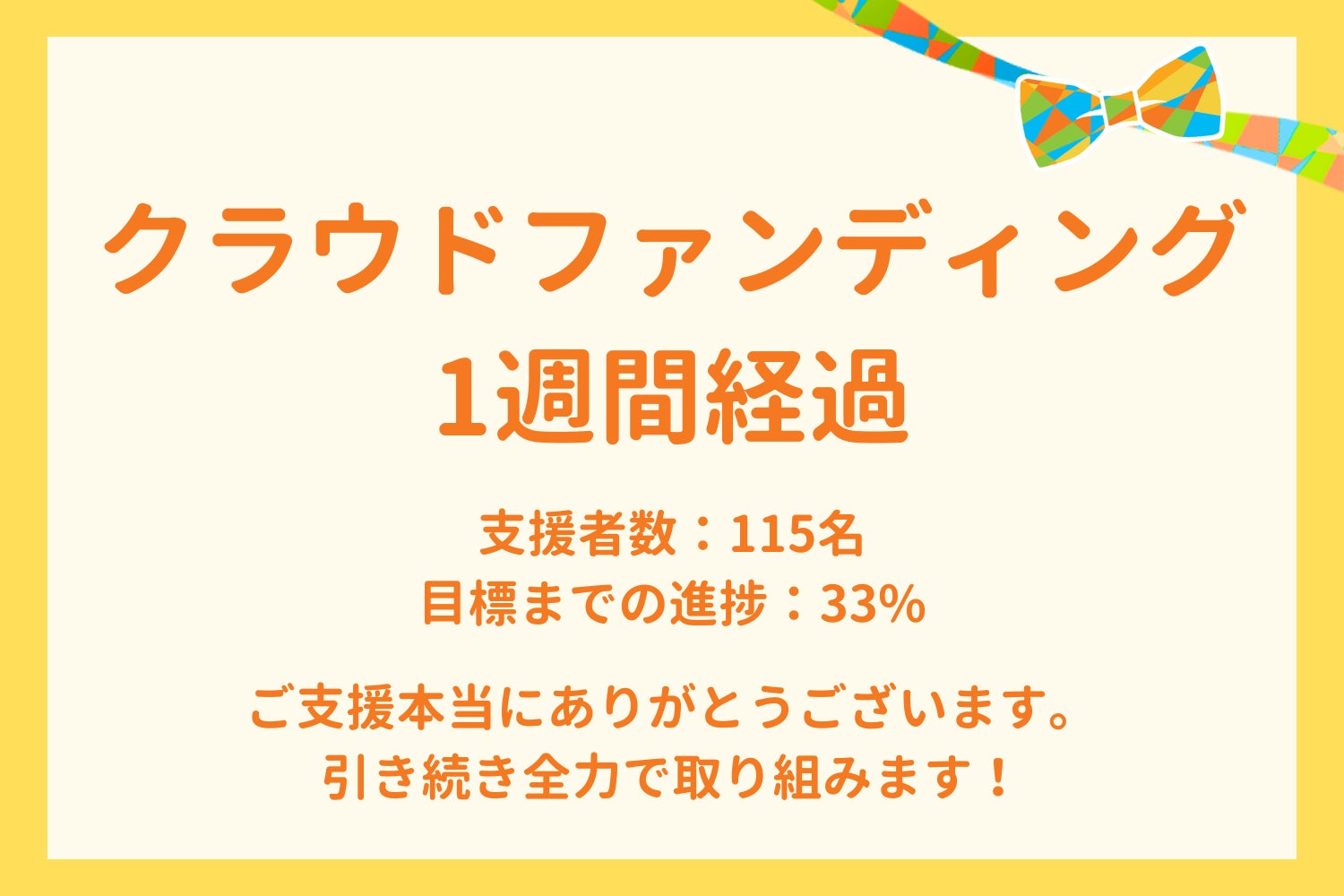 クラウドファンディング開始から1週間が経過してのご報告です。4月11日土曜日時点で、115名の皆様から、目標金額に対して33%のご支援を寄せて頂きました。また、305件のお気に入り登録もいただき、開始早々から、このように多くの皆様に後押しいただいたこと、心より感謝申し上げます。