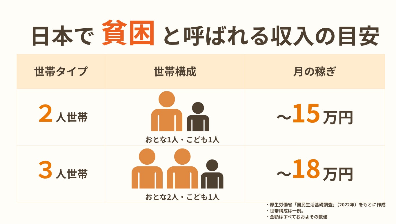 日本では親と子の2人で生活する家庭なら、月の手取りがおよそ15万円に満たないと、貧困層に位置づけられます。15万円でも、貧困層の中では「最も稼いでいる」水準です。それ以下で生活している子どもが、この国に9人に1人いるのです。