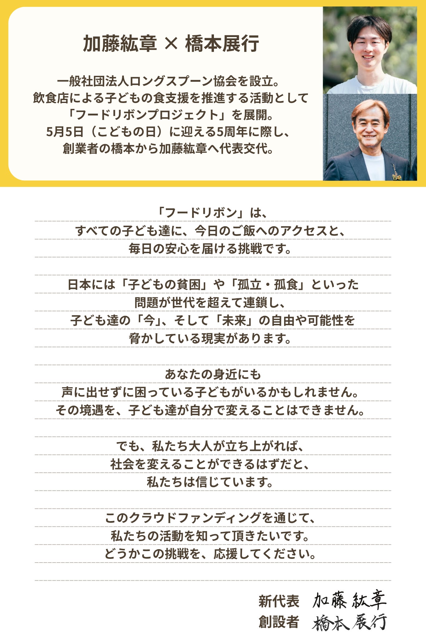 2026年5月5日、こどもの日。フードリボンプロジェクトは設立5周年を迎えます。この大きな節目に、代表のバトンは創設者の橋本展行から、加藤紘章へと引き継がれます。