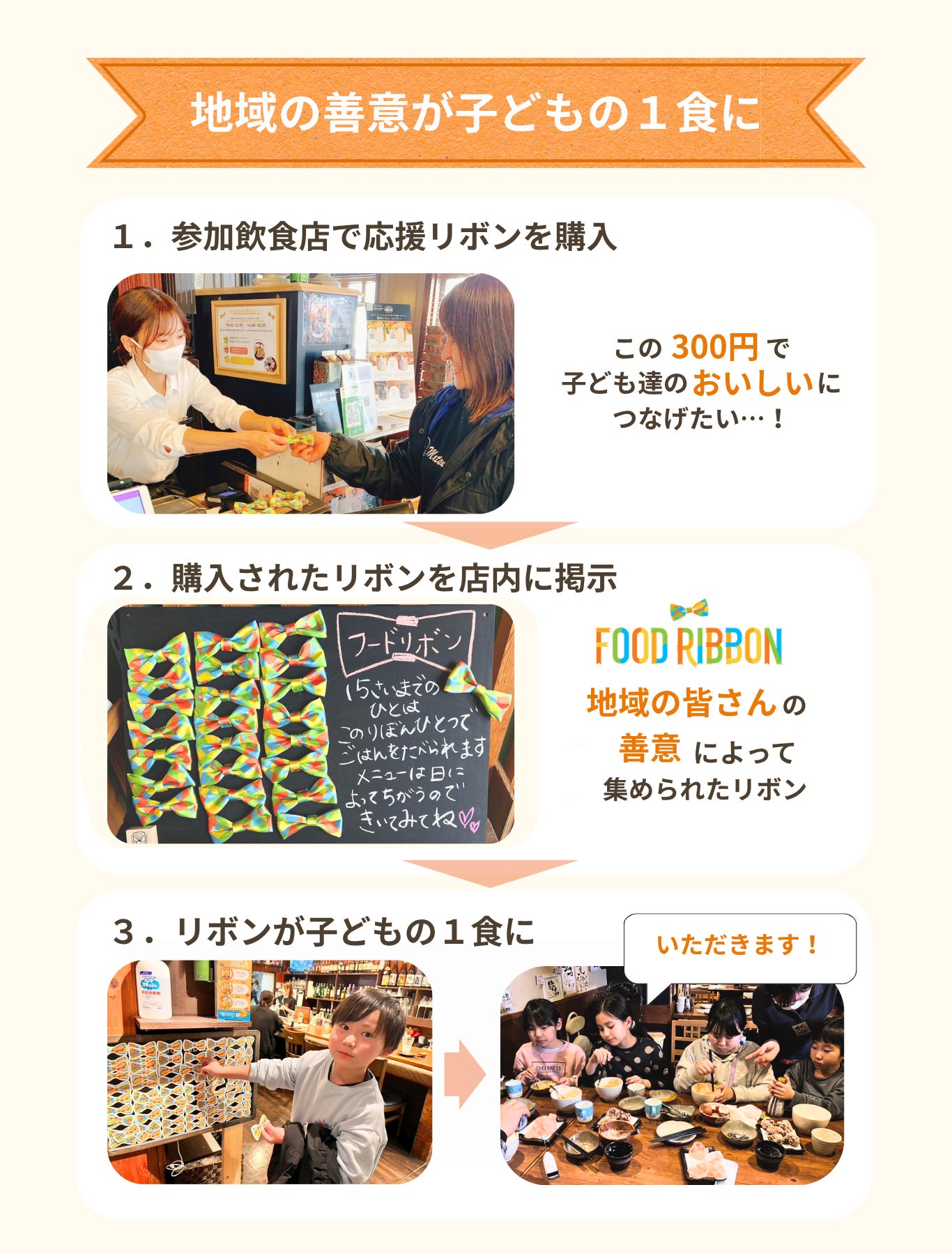 飲食店を利用するお客様が1つ300円でリボンをお店に支援すると、所定の年齢の範囲にいる子どもは、飲食店に飾られたリボンを使うことで、必要な時には誰でも、お店が営業している日には無料で食事ができます。