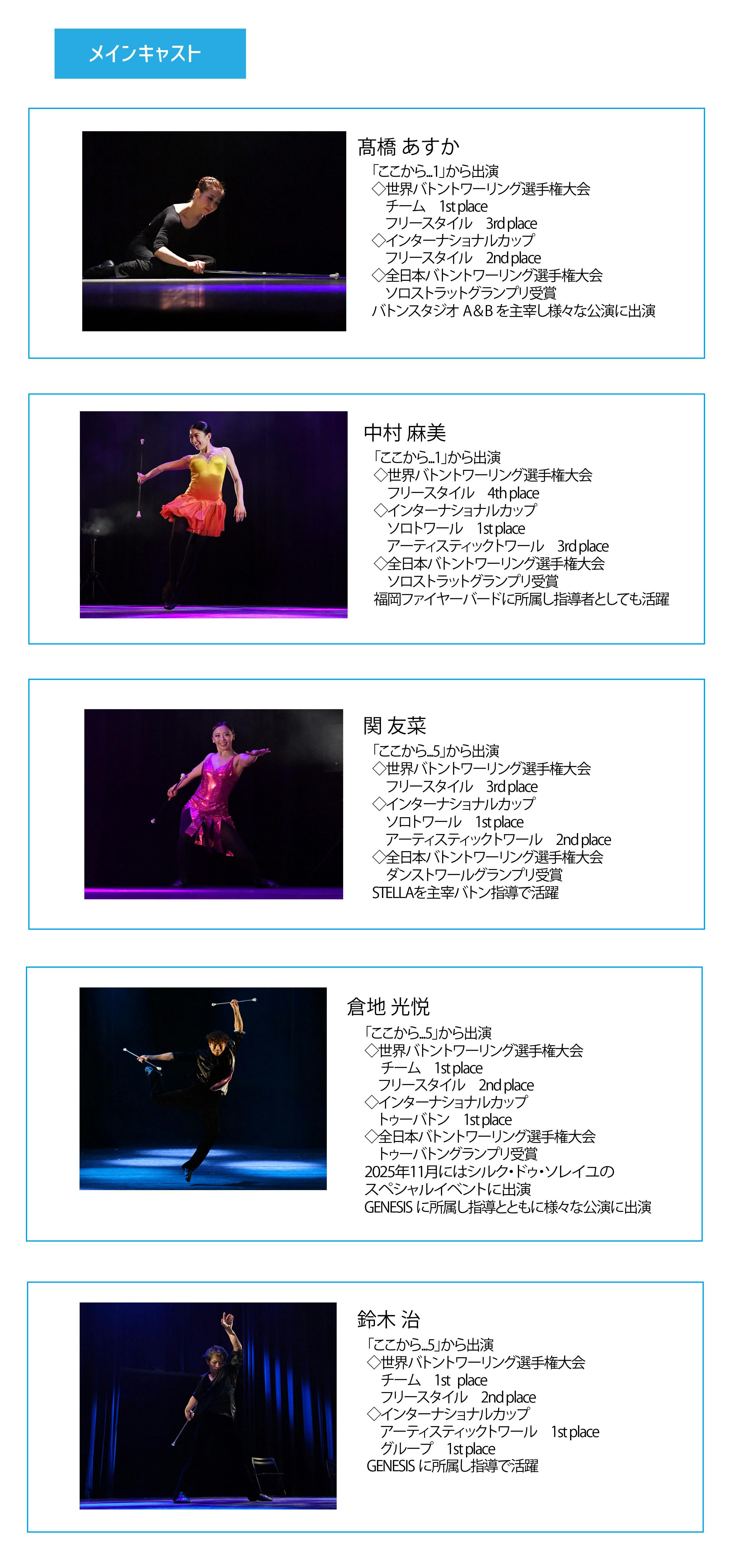 2016年4月、東京日暮里d-倉庫にてバトントワーリング公演「ここから…1」を4名の出演者でスタートし、関東と関西で公演を重ね、2025年には横浜、大阪、名古屋、福岡の4都市公演を開催し、多くの方々にバトントワーリングの魅力を発信し続けています。