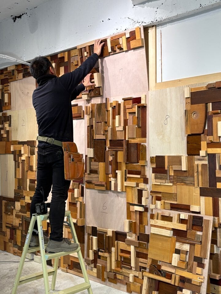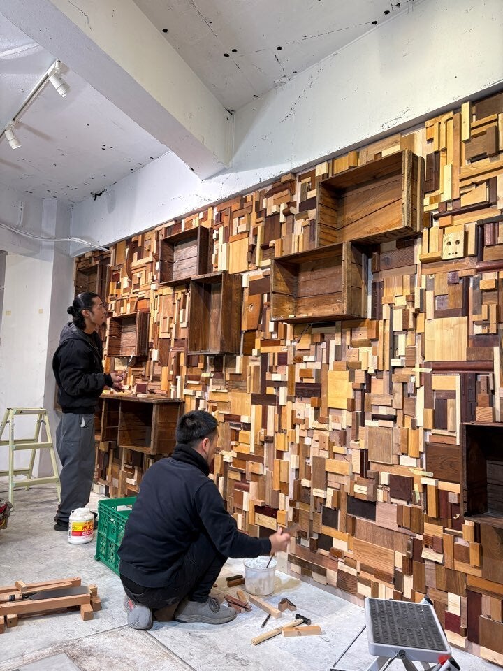 このたび店内の壁の一部を、モザイク壁へと生まれ変わらせました。使用したのは、木の端材やりんご箱、かつて陶器が納められていた木箱など、本来であれば役目を終えてしまう素材たちです。
