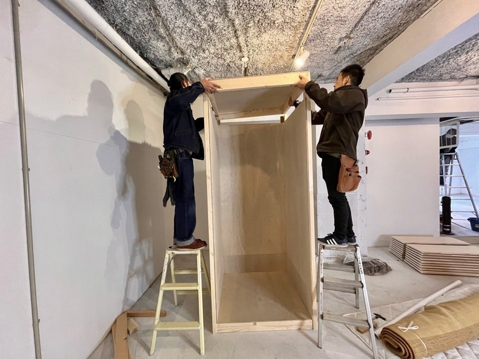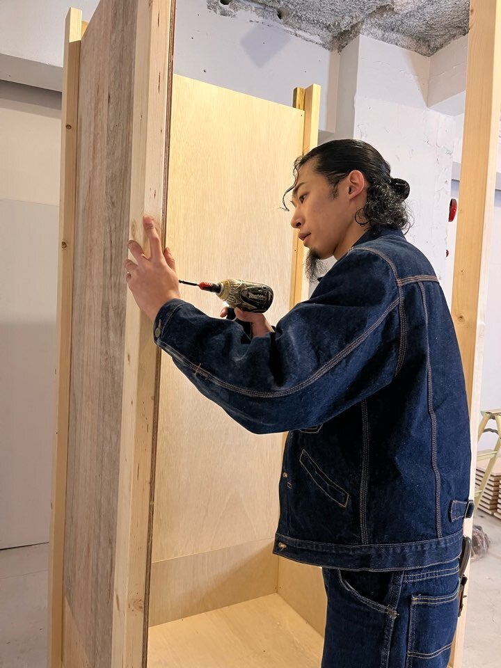 さらに、ヴィンテージ古着の展開にあわせて、フィッティングルームも工房スタッフが一から制作しました。こちらを1時間弱で作り上げた工房スタッフ、すごいです。