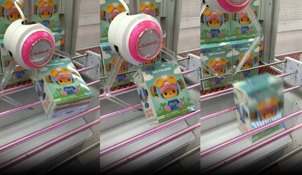 まず技名は「無理やりずり上げ反動落とし」です。筐体はクレナ2でパワー強ですが、それ以上に滑り止めのグリップ力(プレイ前に4本すべてにスプレー噴射でふかれてます)と景品の重量で強烈にペッタペタです。くっついていてギャン寄せでもスライドでも動かない状態。4本のバー全ての滑り止めがペタペタのため通常ずり上げもできない状態。景品の重量・重心、アームのねじれとパワー、ツメの角度、滑り止めの粘着度などを全て考慮し、ゆる寄せ弱から強めにずり上げ、左爪で下角引き抜きを計算しゲットです。