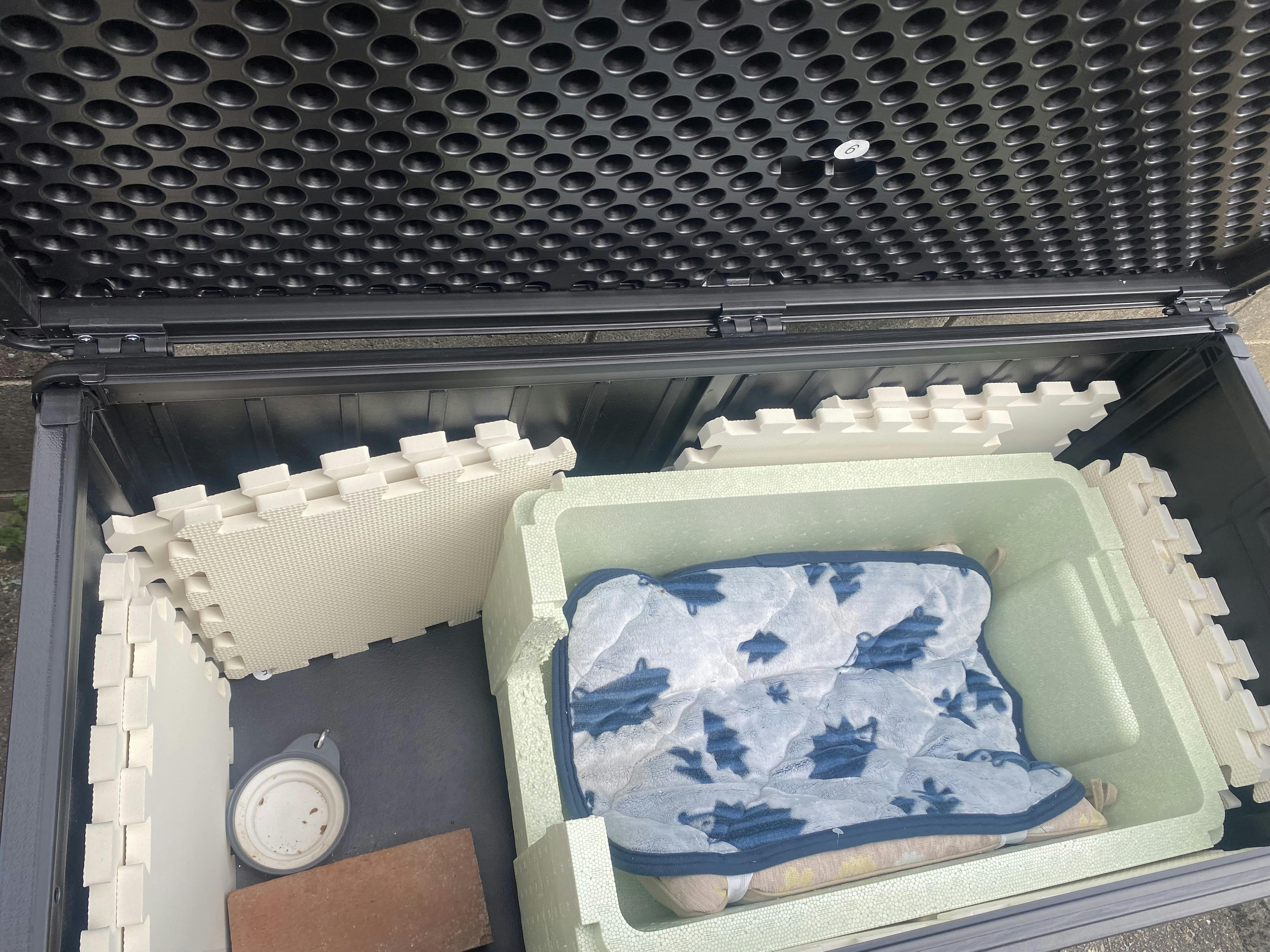 先日の大寒波に備え、急ぎで設置した簡易ハウスにより、猫たちは現在そこで寒さを凌ぐことができています。ひとまず安心できる居場所を確保できました。