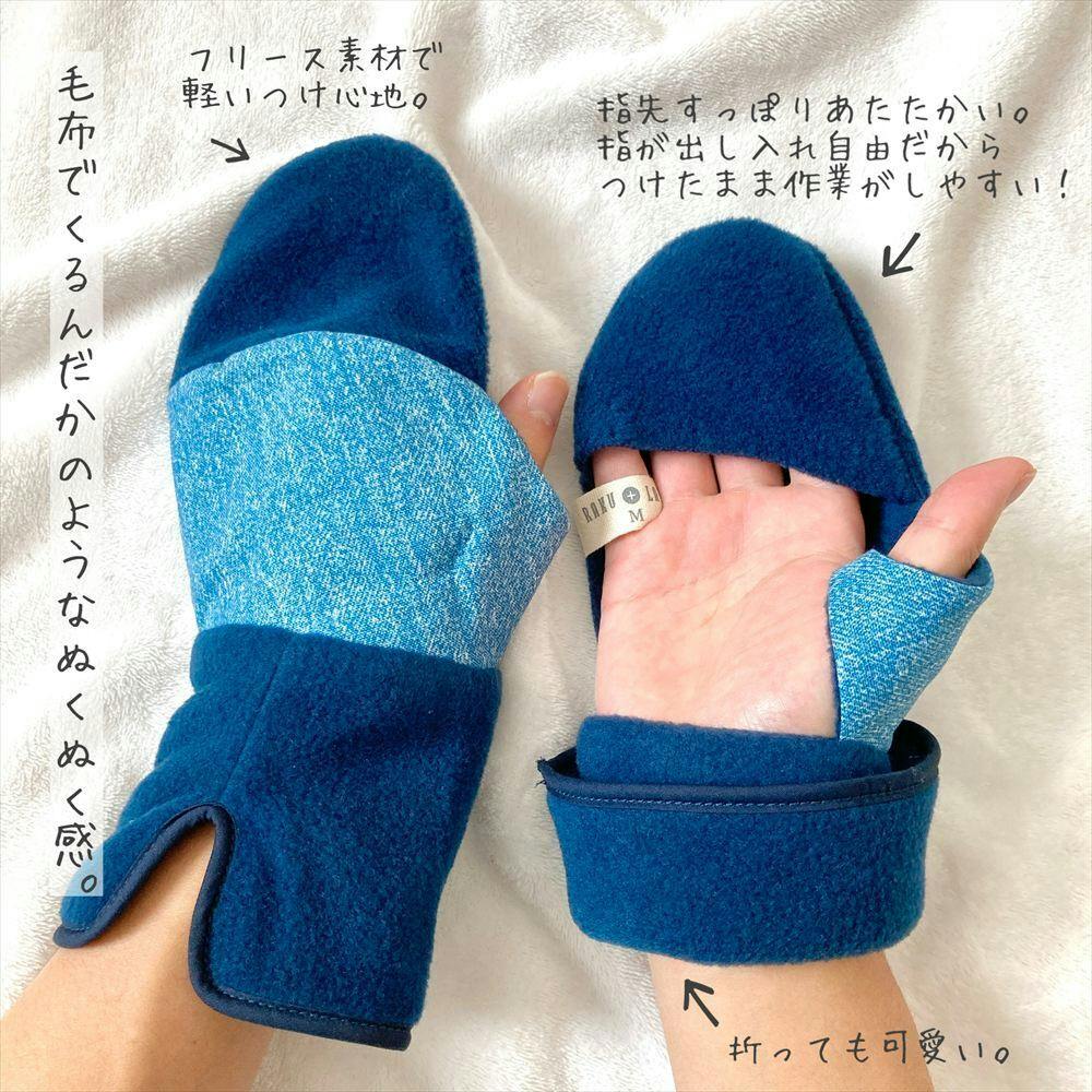 手から放出される熱をフリース生地がしっかりキープ。できるだけ指先まで覆って体温が逃がさず、手作業ができるように手のひらをフリーにしました。フリース生地は保温性が抜群で、体温だけでもとても暖かいのです。