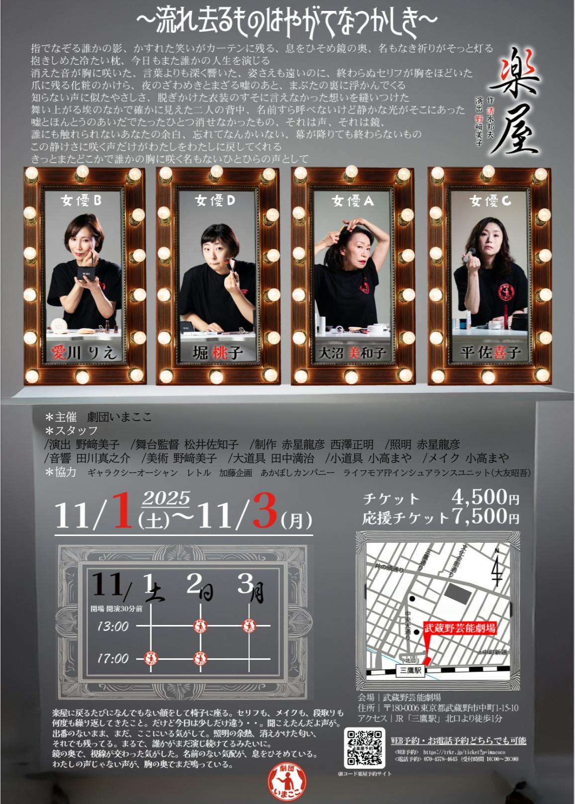 私たちが「楽屋」の公演をすることで、私たちの「今を懸命に生きる」というメッセージ を鮮やかに描き出すことができると考えています。そのためにも是非多くの方に観に来ていただきたい。同時に今後も継続して活動するための応援もお願いしたいと思っています。