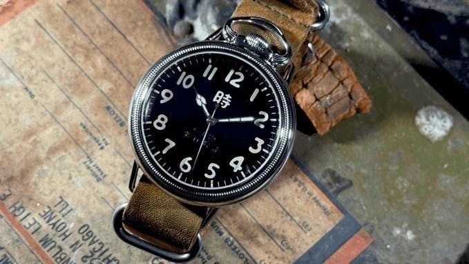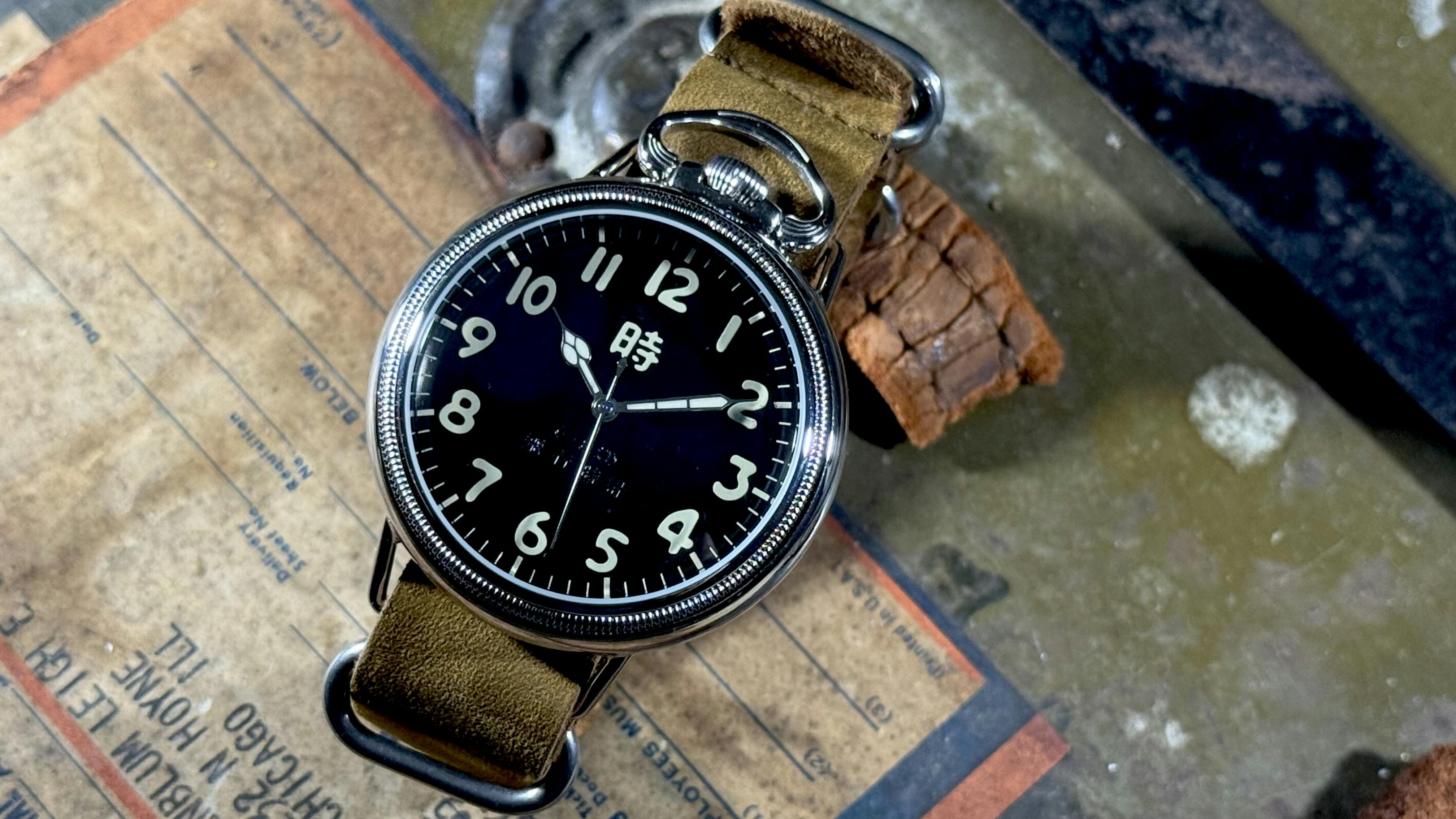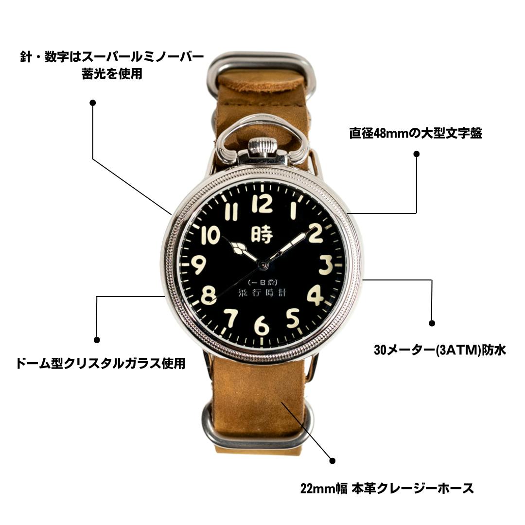 1940年代に日本陸軍で使用された100式飛行時計の復刻版。文字盤の12時位置には「時」の漢字が刻印され、6時位置には「一日捲」と「飛行時計」の文字が忠実に再現されている。オリジナルとの唯一の違いは、文字盤に立体感を持たせ、曲面加工を施している点です。涙型の針がデザインにほのかな可愛らしさを添えています。(上の写真右下の写真は、実際に装着されたオリジナル100式飛行時計です。)