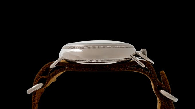 時計の縁には200個の小さな刻みが施され、いわゆるコインエッジベゼルを形成しています。このタイプのベゼルは空軍用時計によく採用されます。パイロットは瞬時に時刻を把握する必要があるため、文字盤は大型化されることが多い。しかし強い日光による反射で時刻が判読しにくくなるのを防ぐため、ベゼルにキザミ加工を入れることで反射を防ぐ役割があります。さらに、縁部は一番衝撃や衝突を受けやすい部位であるため、傷が目立たない機能もあります。この仕上げは機能面でも優れており、傷がつきにくく美しさを長く保つ。過酷な環境下での使用に最適であるのです。