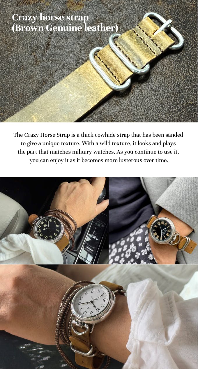 クレイジーホースストラップは、標準で装備されています。厚手の牛革を研磨加工した独特の風合いを持つストラップです。ワイルドな質感は、ミリタリーウォッチにぴったりの見た目と使い心地を実現します。使い込むほどに光沢が増し、経年変化を楽しむことができます。