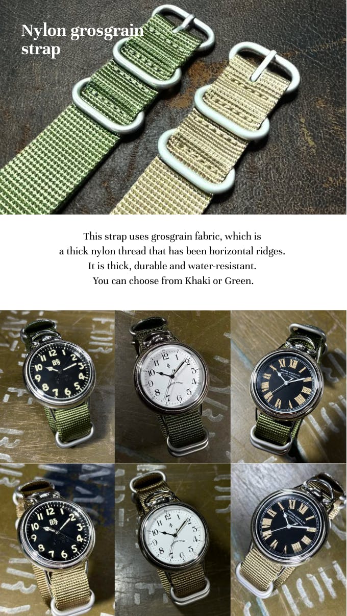 このストラップにはグログラン生地を使用しています。これは横方向に溝が入った太いナイロン糸です。厚手で耐久性があり、耐水性も備えています。カーキ色または緑色からお選びいただけます。