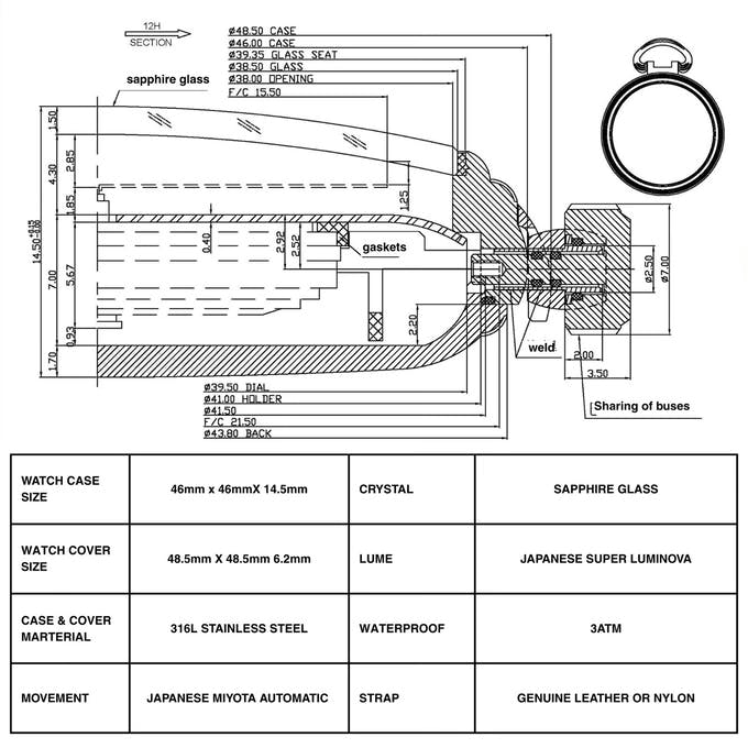 サイズ:46mm × 46mm(リューズ含む59.60mm)× 14.5mm