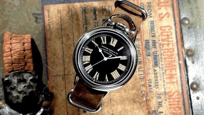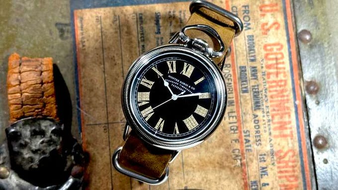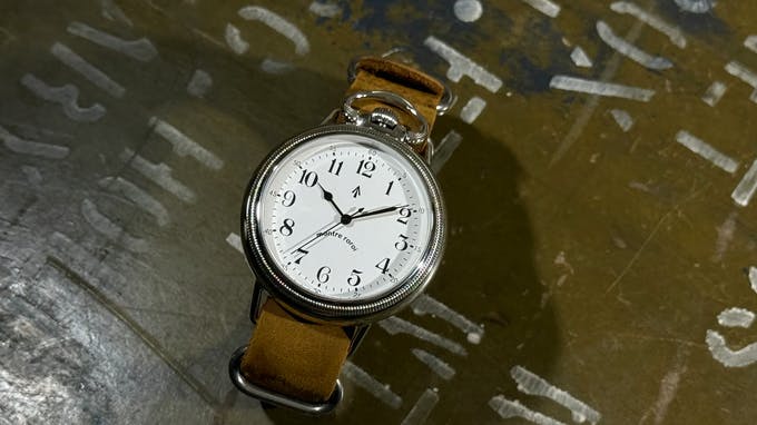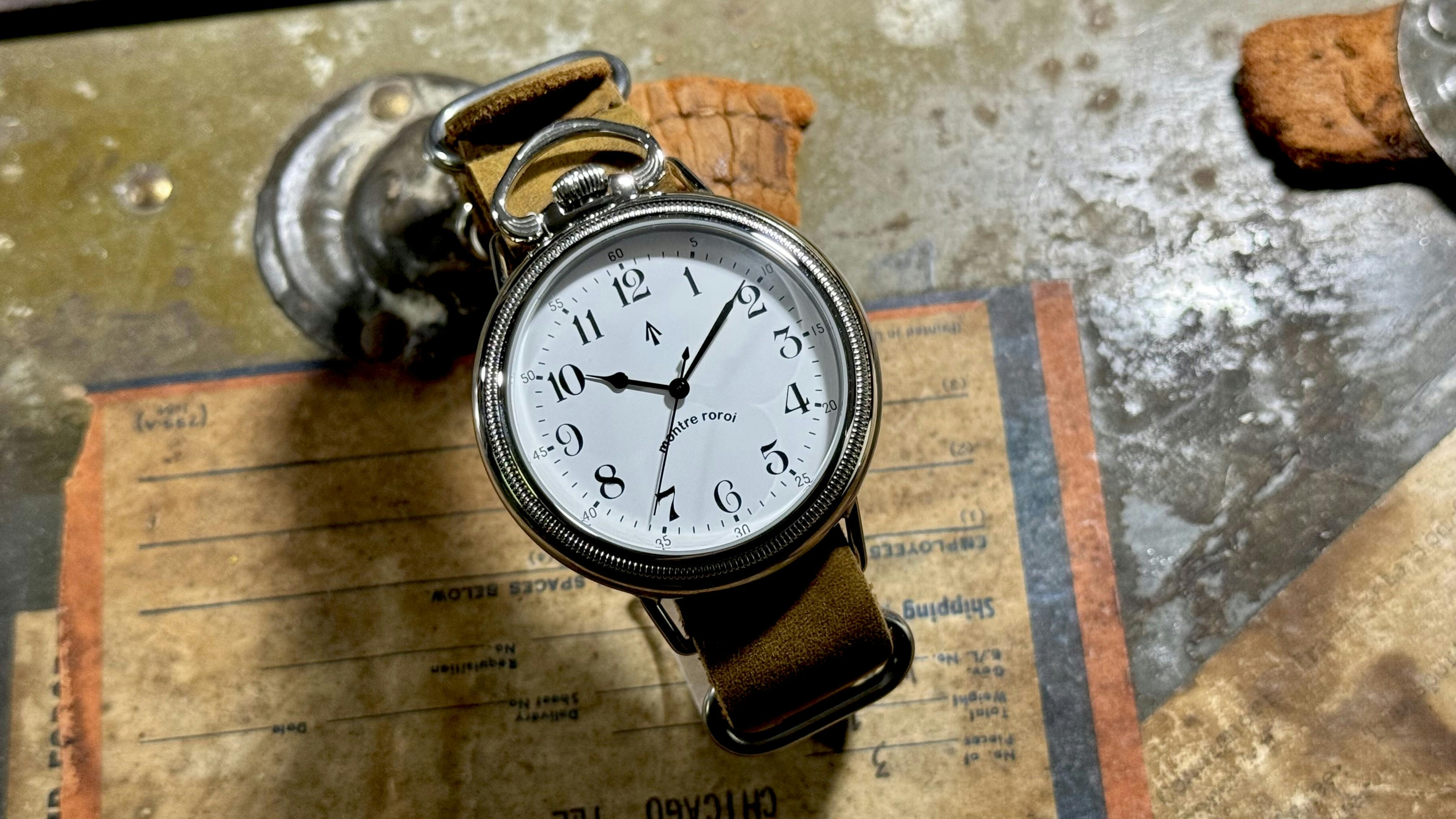 この時計は1904年英国製時計へのオマージュです。文字盤にはローマ数字が採用されています。生死に関わる時計の精度は飛躍的に向上しました。その一因は戦争ですが、それ以前には鉄道が関係していました。英国では鉄道網が発達するにつれ、各鉄道会社が本社で設定した時刻を基に独自の時刻を管理し、主要な乗換駅では各社の時刻が表示されていました。このため、乗り継ぎや乗換に関する混乱が頻発しました。米国では単線運行時代、衝突事故や事故が頻繁に発生し、人命が失われる結果となりました。事故を減らすため、共通の標準時刻が必要とされた。1848年までに鉄道会社はグリニッジ標準時を基にした標準時刻に合意し、人々は時計をこの時刻に合わせるようになった。この時計はデザインを最優先に作られているため、発光機能はやや控えめになっています。