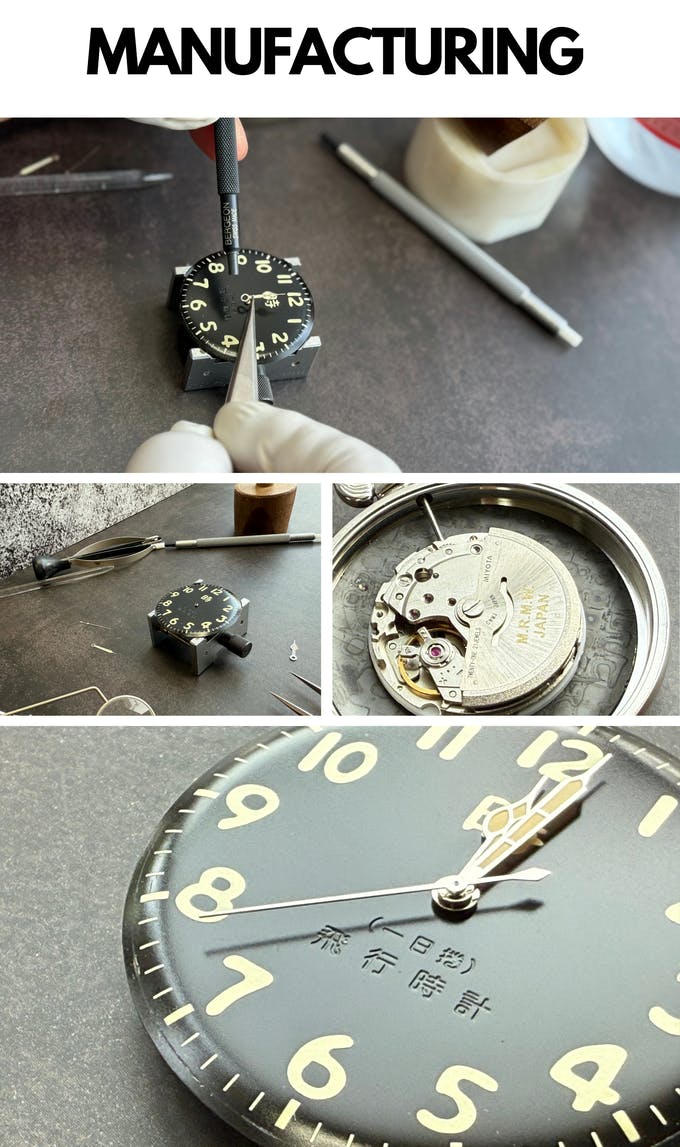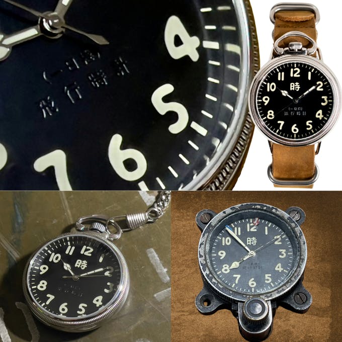 1940年代に日本陸軍で使用された100式飛行時計の復刻版。文字盤の12時位置には「時」の漢字が刻印され、6時位置には「一日捲」と「飛行時計」の文字が忠実に再現されている。オリジナルとの唯一の違いは、文字盤に立体感を持たせ、曲面加工を施している点です。涙型の針がデザインにほのかな可愛らしさを添えています。(上の写真右下の写真は、実際に装着されたオリジナル100式飛行時計です。)