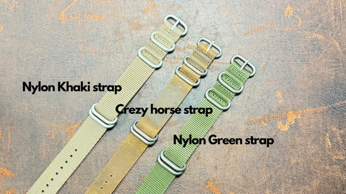 左からナイロン製カーキ(砂漠色)、本革製クレイジーホース、ナイロン製グリーンストラップ