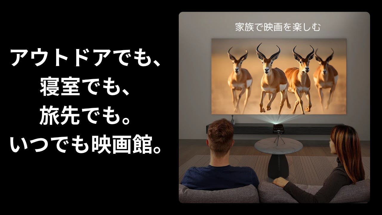 自宅はもちろん、キャンプ・旅行先・プレゼン現場など、あらゆるシーンを大画面エンタメ空間に変えてくれます。
