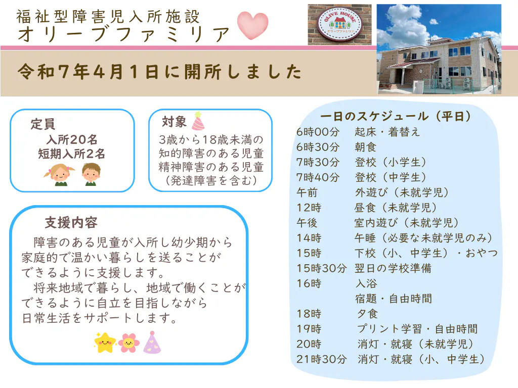 福祉型障害児入所施設オリーブファミリアが千葉市緑区鎌取町に開所して7か月が経ちました。現在、保護者が家庭で養育することが困難な障害のある未就学児から中学生までの児童(男子6名、女子11名)が生活しています。小学生、中学生の児童達は、平日近隣の学校に通い、未就学児は施設で室内遊びや外遊び、レクなどを行い、毎日元気いっぱいに過ごしています。